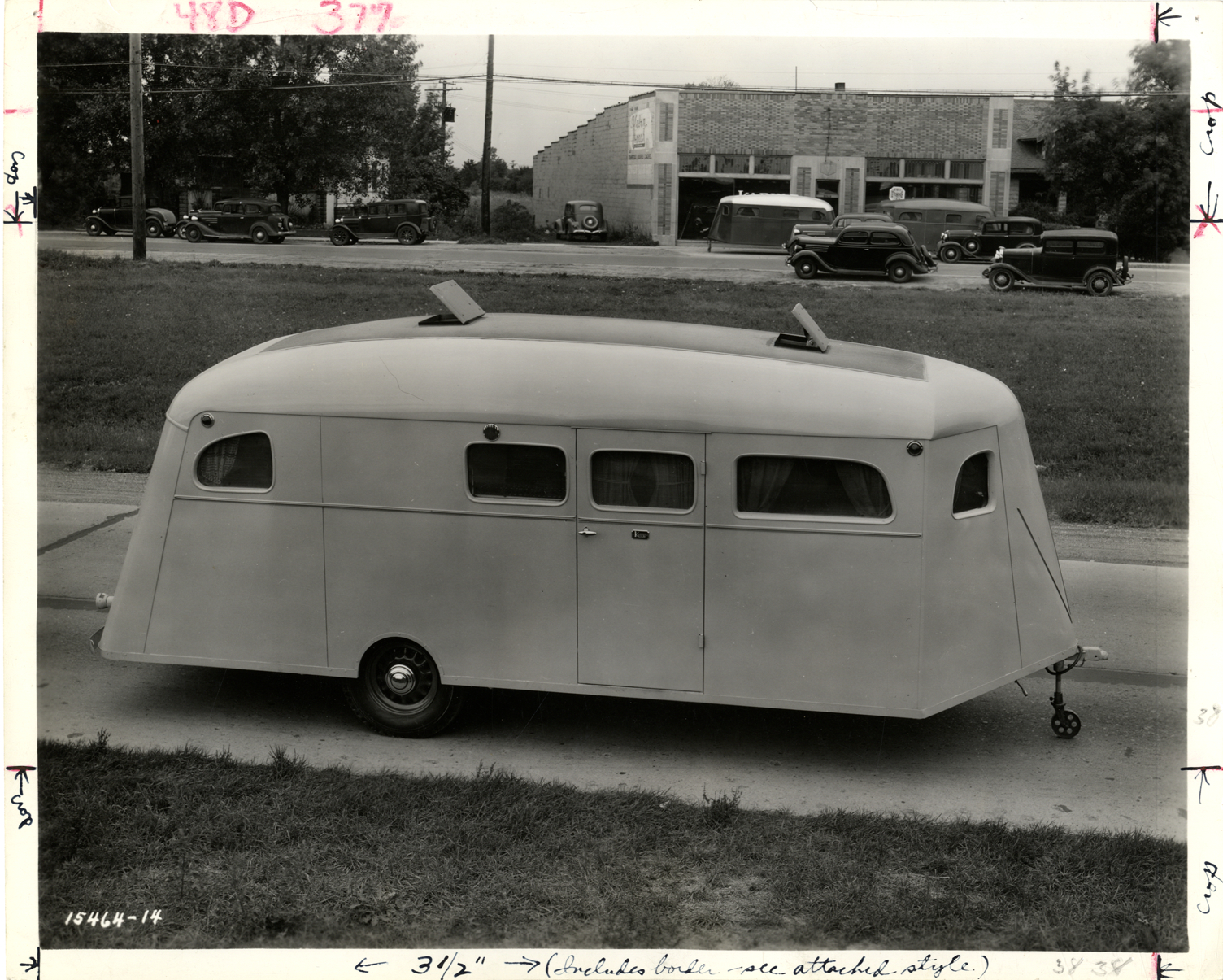 View of a Kabin Koach trailer. Cars and trailers parked in front of brick building in background. Handwritten on back: "Kabin Koach. Camping, 1936."
