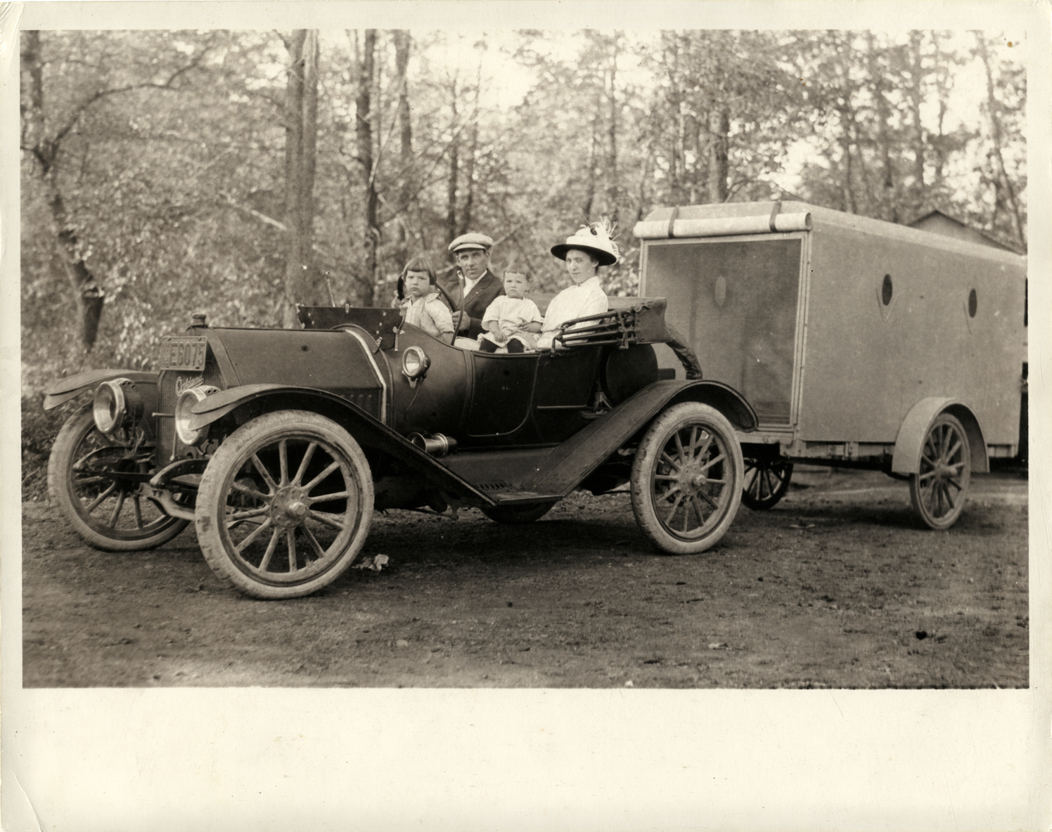 View of a family in an Oakland car, pulling a trailer. Handwritten on back: "Camping."