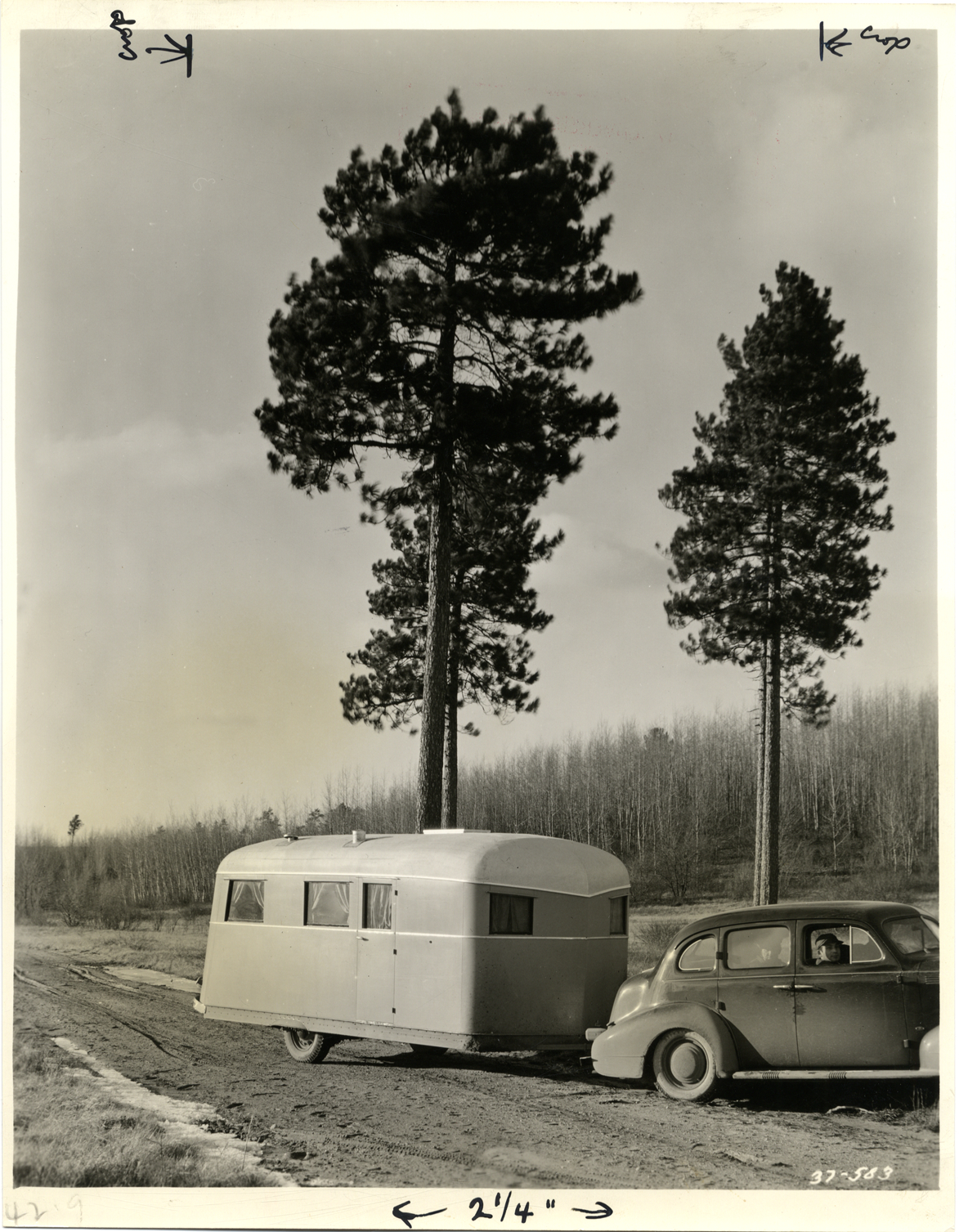 View of a car pulling Covered Wagon trailer in the Lunden Hunting Refuge in Montmorency County, Michigan. Label on back: "Photo by the Covered Wagon Co. Three tall pines and a house trailer, off the beaten trail, deep in the Lunden Hunting Refuge in Montmorency County, Michigan. Among the most sparsely settled counties in the state, the chief inhabitants of the region are deer and wild life." Stamped on back: "Photo by Covered Wagon Company." Handwritten on back: "Camping, ca. 1937."