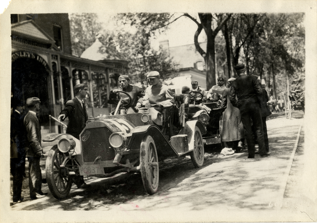 View of several motorists in Cartercar no. 5, followed by another car, and surrounded by onlookers. Stamped on back: "Spooner & Wells, Inc., photographers, telephones 3472-3473 Columbus, 1931 Broadway, New York." Handwritten on back: "Cartercar, ca. 1910."