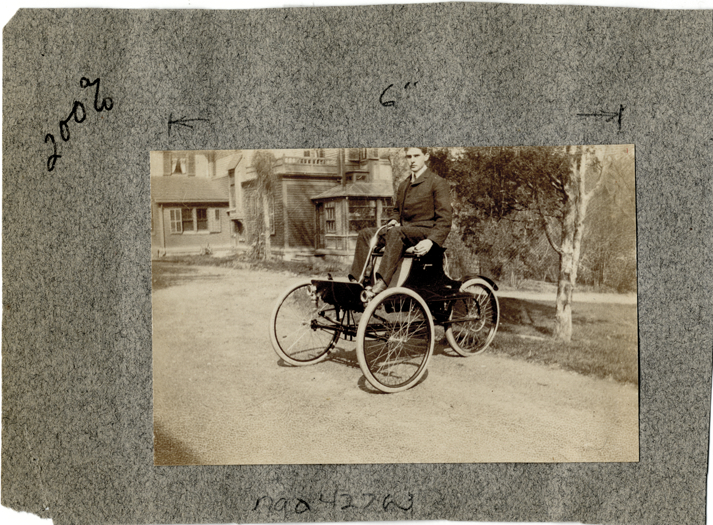 View of a man posing in a 1901 Carver three wheel car. Handwritten on stock: "Carver three wheeler, 1901." Label accompanying photographs: "The Carver 'trimobile.' Contributed by Allen F. Carver, Jr. There are presented two photos of the car during construction and two when completed. Note the clutch cover and larger rear sprocket when completed. The Crest engine used was made by the Crest Manufacturing Co., Cambridgeport, Mass., who also made and sold light four wheel cars. The longest continuous trip made by the Carver three-wheel car was from Brooklyn, N.Y. to Westhampton, Long Island and home again. The trip was made at night so as not to frighten horses."