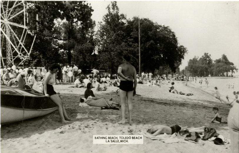 View of beachgoers at Toledo Beach in La Salle, Michigan. Printed on front: "Bathing beach, Toledo Beach, La Salle, Mich."
