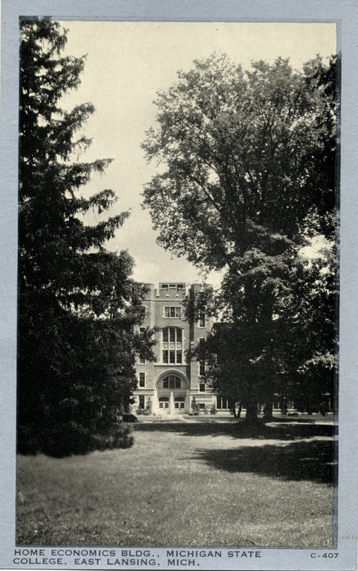 View of the Home Economics Building at Michigan State College in East Lansing, Michigan. Printed on front: "Home Economics Bldg., Michigan State College, East Lansing, Mich." Printed on back: "Mfd. by Wayne Paper Box & Prtg. Corp., Fort Wayne, Ind."