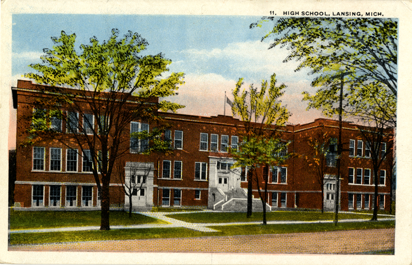 View of Lansing High School in Lansing, Michigan. Printed on front: "11. High School, Lansing, Mich." Printed on back: "Published by M.E. [sic] Hamm, Toledo, Ohio. Made in U.S.A. H.H. Hamm, Toledo, Ohio. C.T. American Art. CT Co., Chicago."