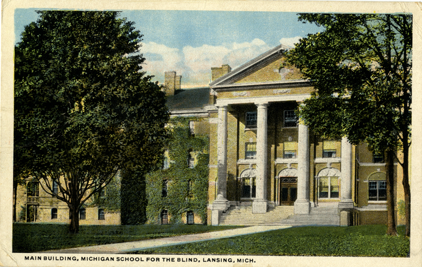 View of the Main Building of the Michigan School for the Blind in Lansing, Michigan. Printed on front: "Main Building, Michigan School for the Blind, Lansing, Mich." Printed on back: "T.C. Hodson & Son, Lansing, Mich. Made in U.S.A. C.T. American Art. CT Co., Chicago."