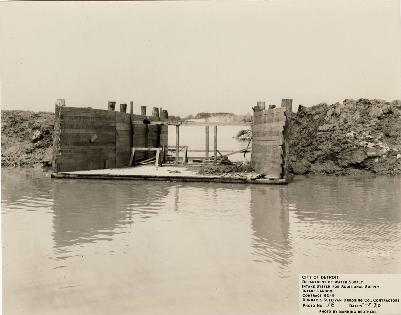 View of flume for carrying water from hydraulic filling operations for the Detroit water supply system. Printed on front: "City of Detroit. Department of Water Supply. Intake system for additional supply. Intake lagoon. Contract RC-9. Dunbar & Sullivan Dredging Co., contractors. Photo no. 18. Date: 5-5-30. Photo by Manning Brothers." Typed on back: "Flume for carrying the water from the hydraulic filling operations across the inlet to the Belle Isle canal system at the middle bridge on the east end of the island."