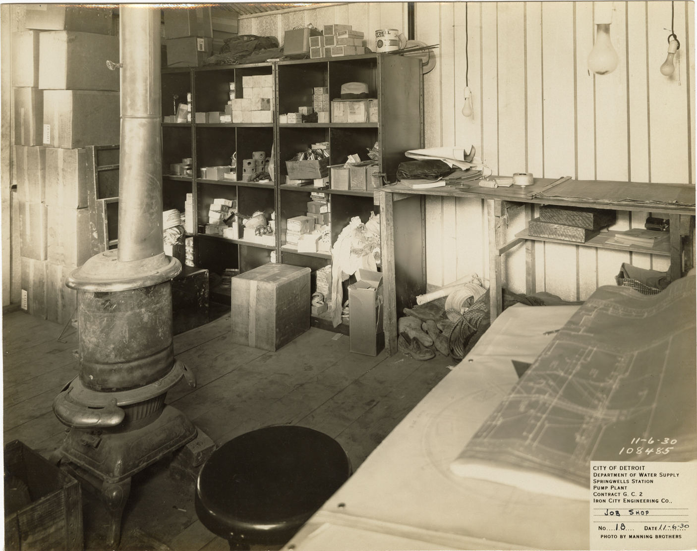 View of interior of the job shop of the Springwells Station pump plant during construction, Detroit water supply system. Room contains stove, shelves, supplies and blueprints. Printed on front: "City of Detroit. Department of Water Supply. Springwells Station pump plant. Contract G.C. 2. Iron City Engineering Co. Job shop. No. 18. Date: 11-6-30. Photo by Manning Brothers."