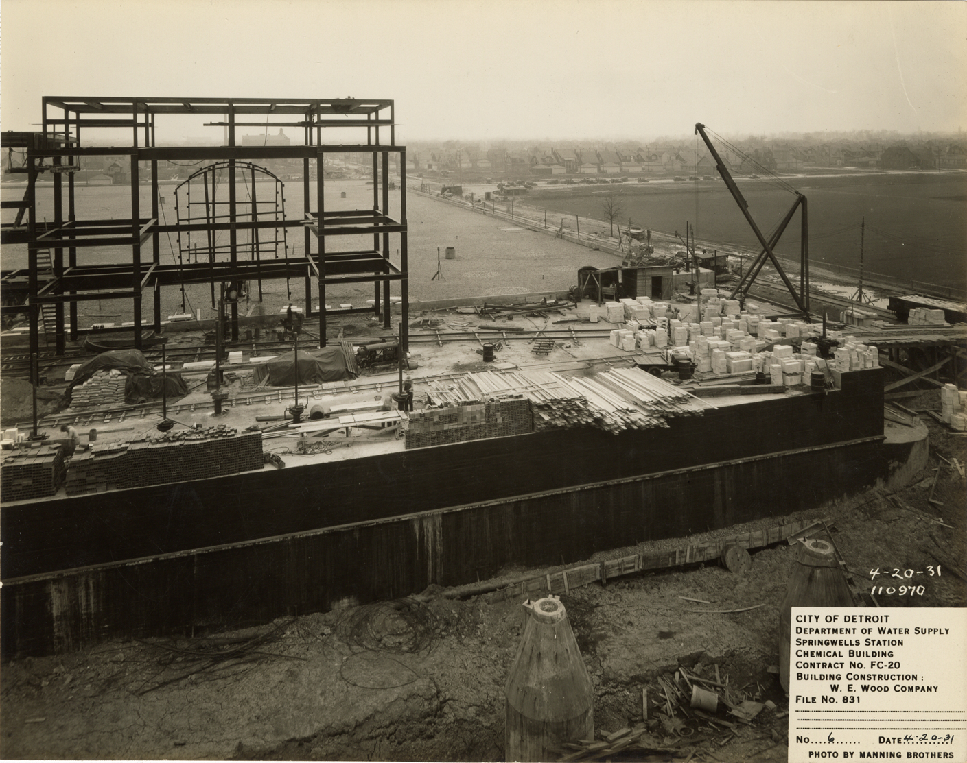 View of Chemical Building in the Springwells Station treatment plant during construction, Detroit water supply system. Printed on front: "City of Detroit. Department of Water Supply. Springwells Station. Chemical Building. Contract No. FC-20. Building construction: W.E. Wood Company. File no. 831. No. 6. Date: 4-20-31. Photo by Manning Brothers." Typed on back: "View looking west from Wood's mixing tower. Chemical Building in left foreground. Note: 5 & 6 make a panorama."