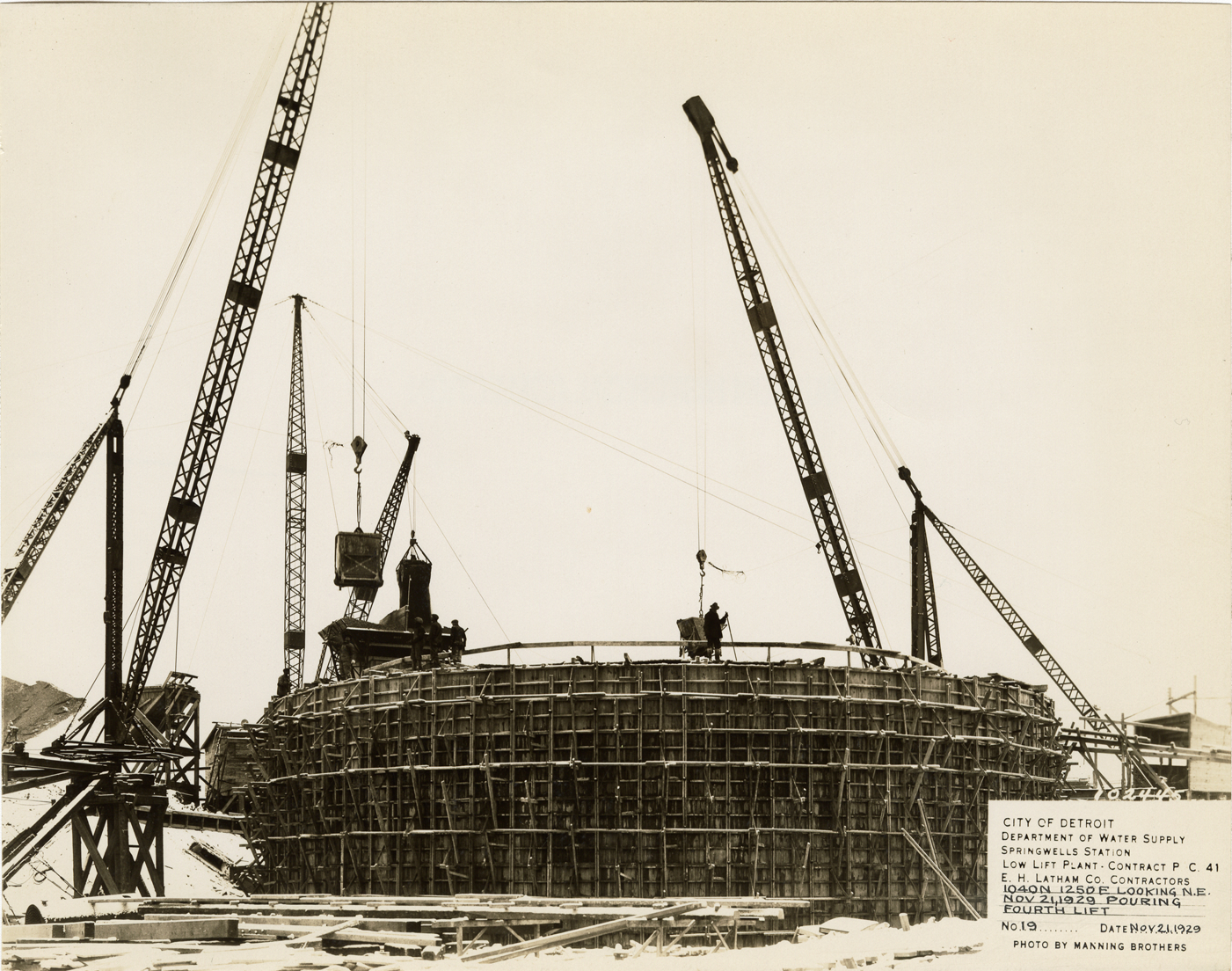 View of low lift plant in the Springwells Station treatment plant during construction, Detroit water supply system. Printed on front: "City of Detroit. Department of Water Supply. Springwells Station. Low lift plant. Contract P.C. 41. E.C. Latham Co., contractors. 1040N 1250E looking N.E. Nov. 21, 1929. Pouring fourth lift. No. 19. Date: Nov. 21, 1929. Photo by Manning Brothers."
