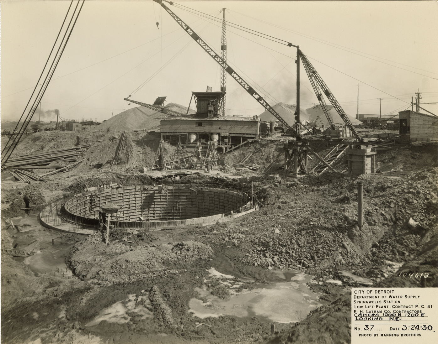 View of low lift plant in the Springwells Station treatment plant during construction, Detroit water supply system. Cranes on construction site. Printed on front: "City of Detroit. Department of Water Supply. Springwells Station. Low lift plant. Contract P.C. 41. E.C. Latham Co., contractors. Camera 1000N, 1200E looking N.E. No. 37. Date: 3-24-30. Photo by Manning Brothers."