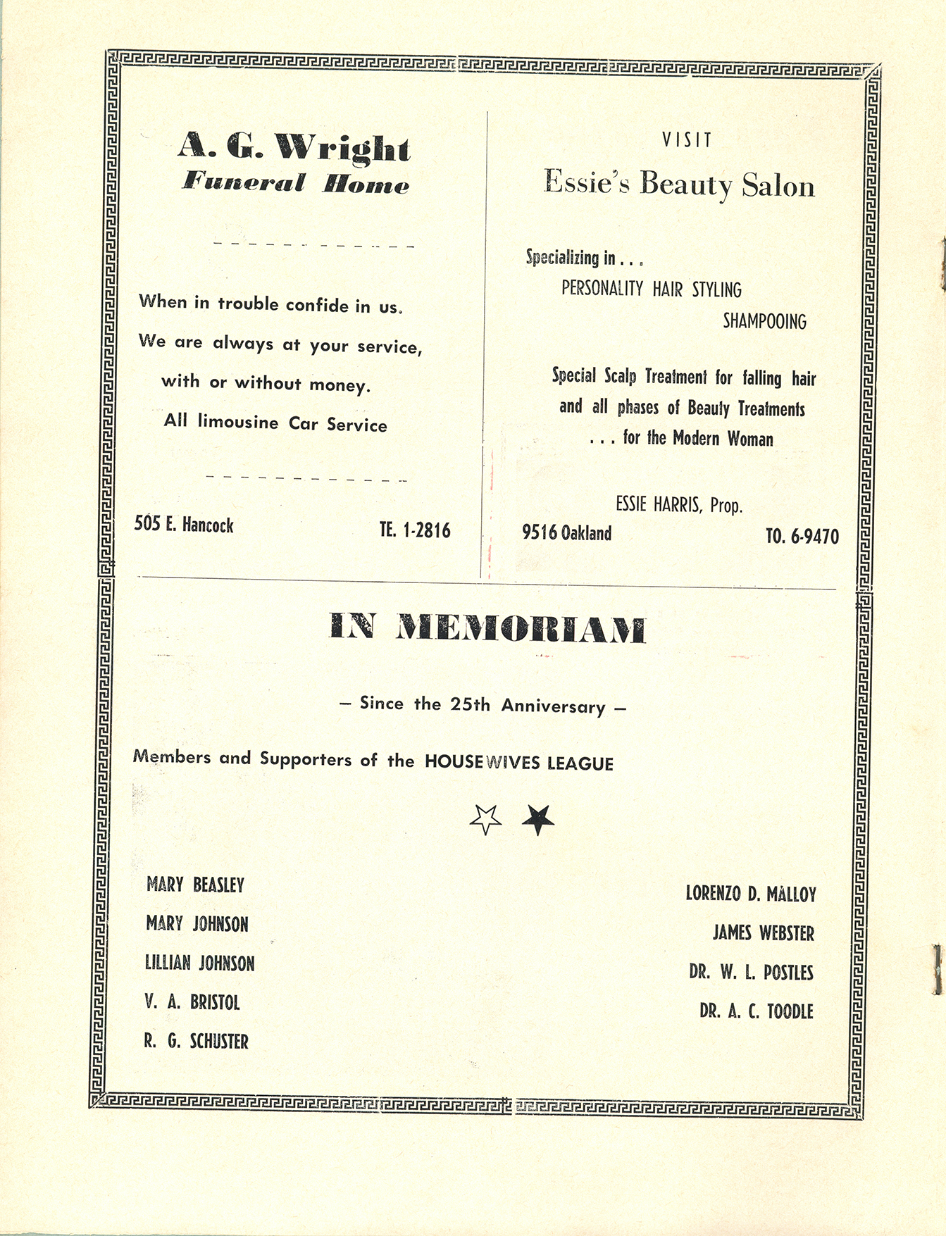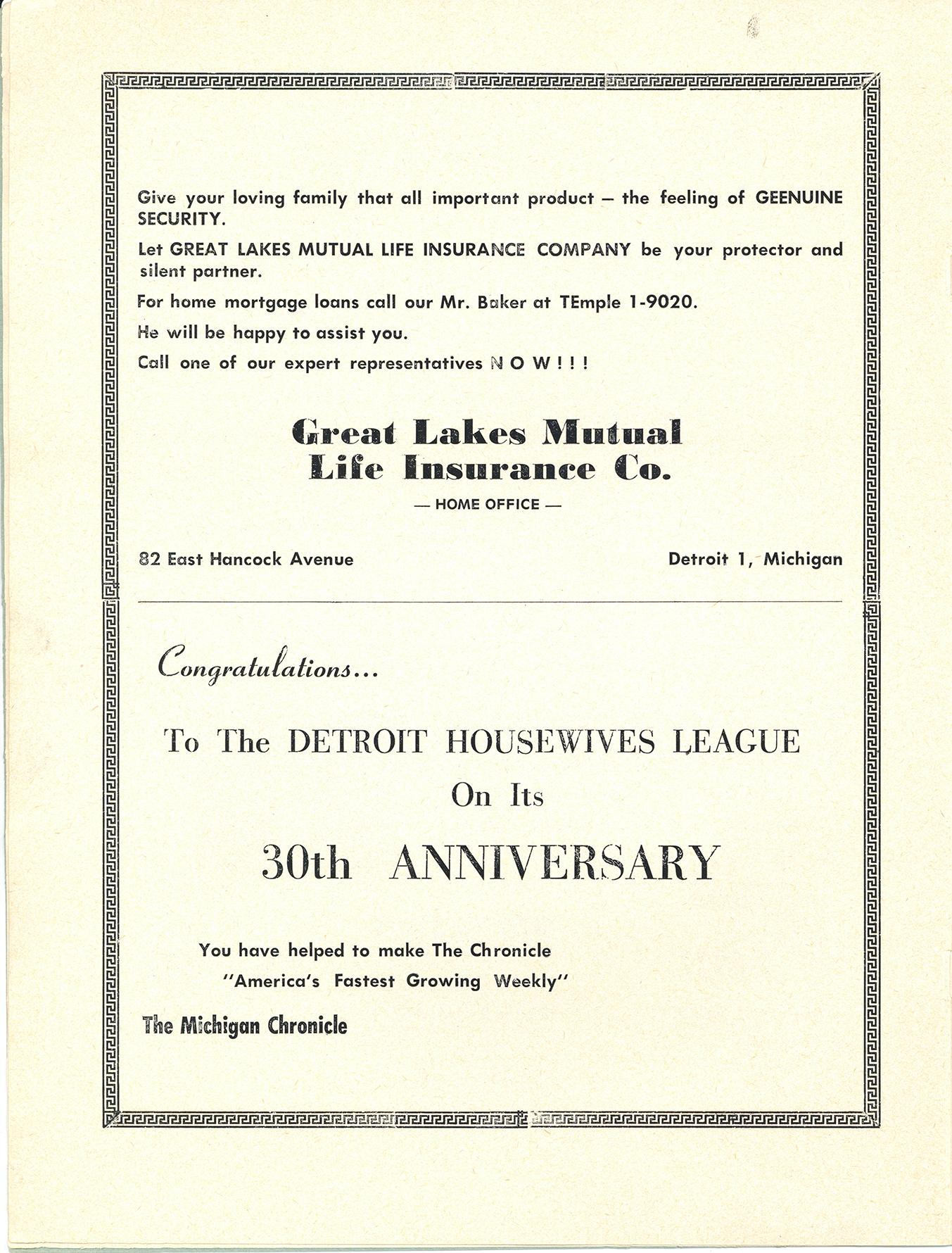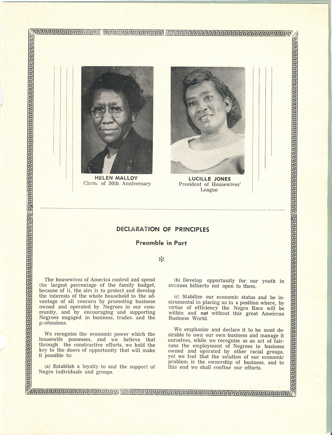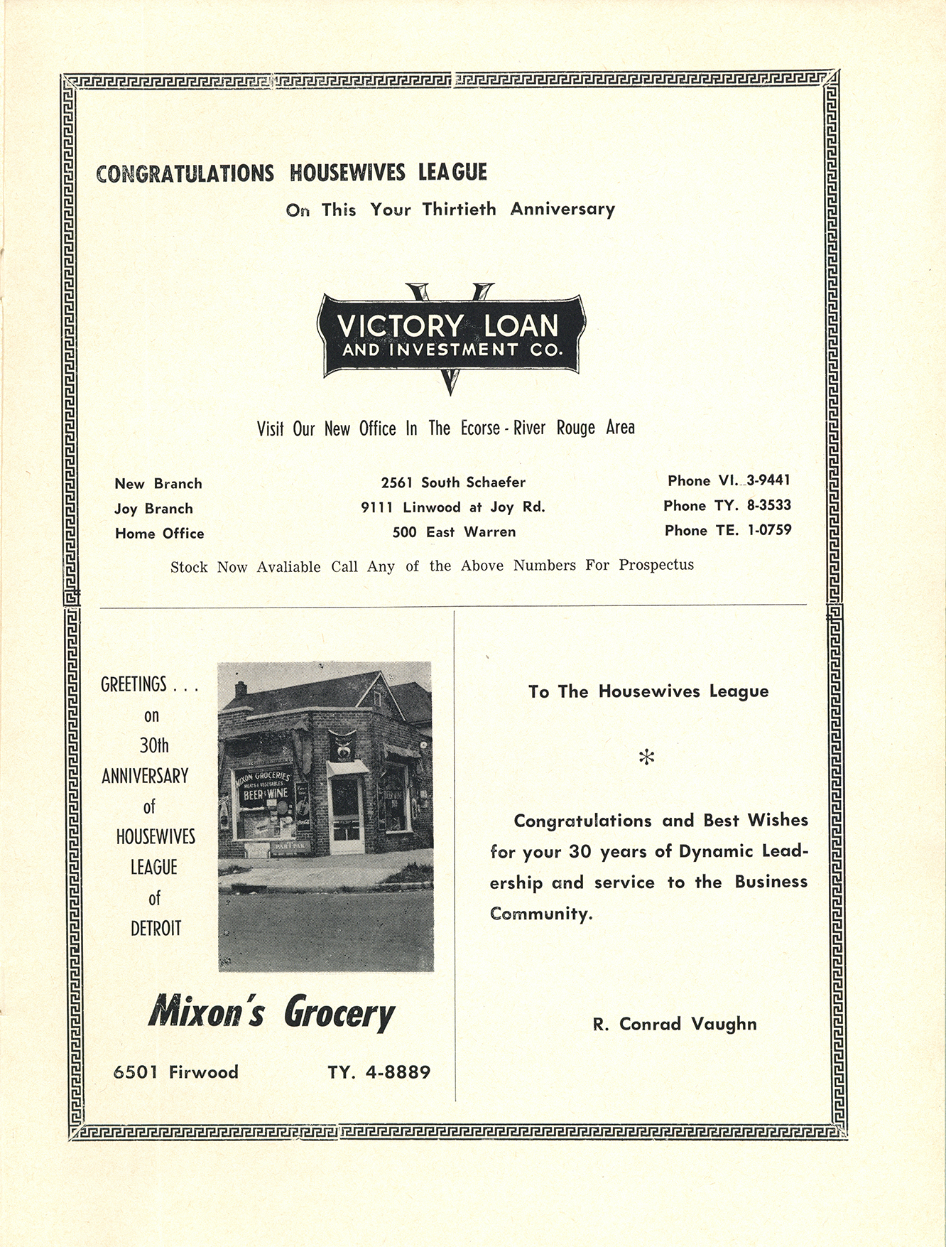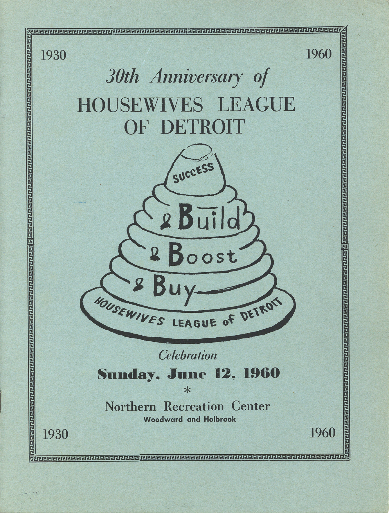 Program for the 30th anniversary of the Housewives League of Detroit. Printed on front: "1930, 1960. 30th anniversary of Housewives League of Detroit. Celebration, Sunday, June 12, 1960. Northern Recreation Center, Woodward and Holbrook. Success, build, boost, buy. Housewives League of Detroit." Includes list of past presidents, declaration of principles, rally song, advertisements and portraits of founders and chairpersons.