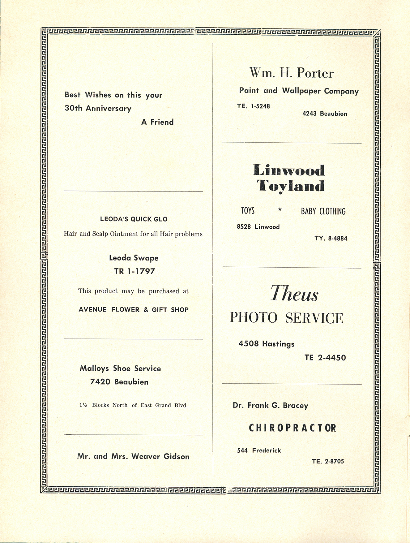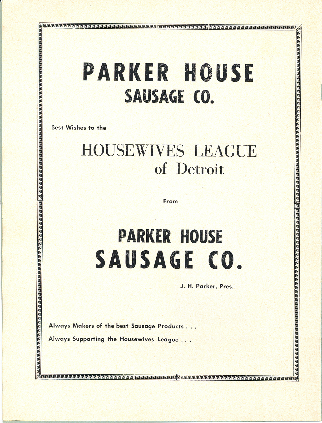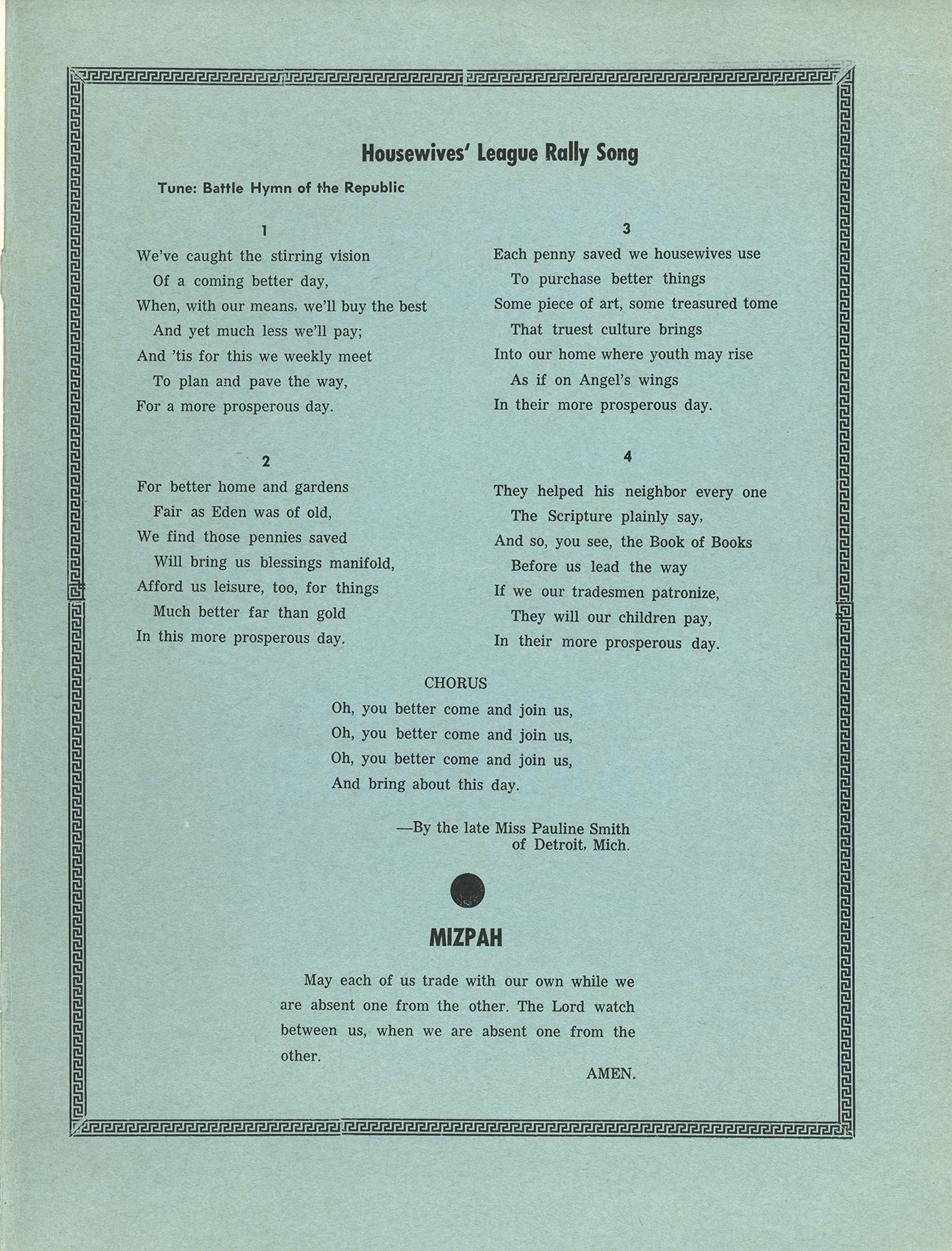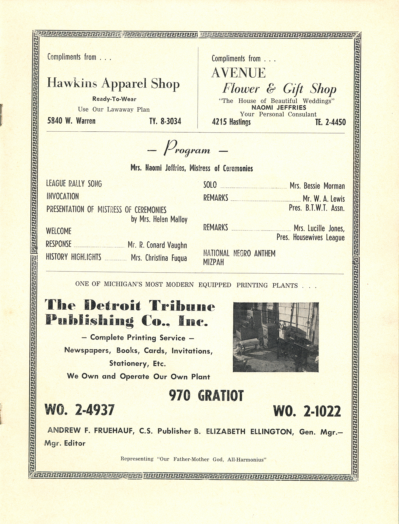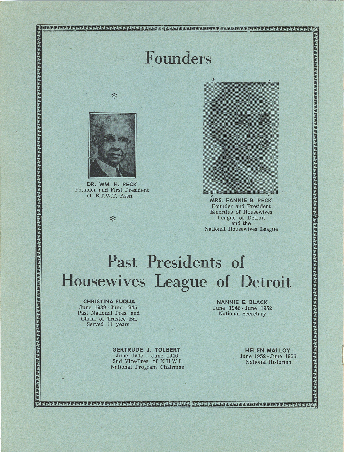 Program for the 30th anniversary of the Housewives League of Detroit. Printed on front: "1930, 1960. 30th anniversary of Housewives League of Detroit. Celebration, Sunday, June 12, 1960. Northern Recreation Center, Woodward and Holbrook. Success, build, boost, buy. Housewives League of Detroit." Includes list of past presidents, declaration of principles, rally song, advertisements and portraits of founders and chairpersons.