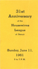 Invitation for the 31st anniversary of the Housewives League of Detroit. Printed on invitation: "You are cordially invited to attend the 31st anniversary of the Housewives League of Detroit. Sunday, June 11, 1961, 5 to 7 p.m. Northern Recreation Center, 8904 Woodward. Musical program and fashion, refreshments. Mrs. Louise Jones, Chairman. Mrs. Naomi Jeffries, President."