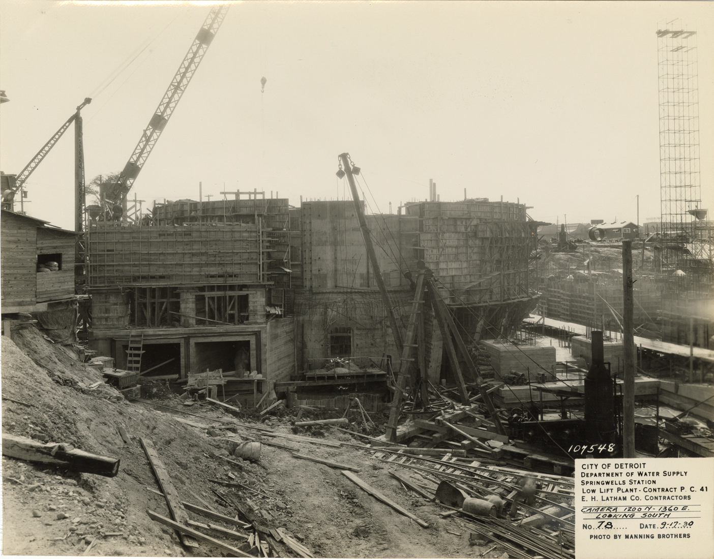 View of low lift plant in the Springwells Station treatment plant during construction, Detroit water supply system. Printed on front: "City of Detroit. Department of Water Supply. Springwells Station. Low lift plant. Contract P.C. 41. E.C. Latham Co., contractors. Camera 1200N-1360E looking south. No. 78. Date: 9-17-30. Photo by Manning Brothers."