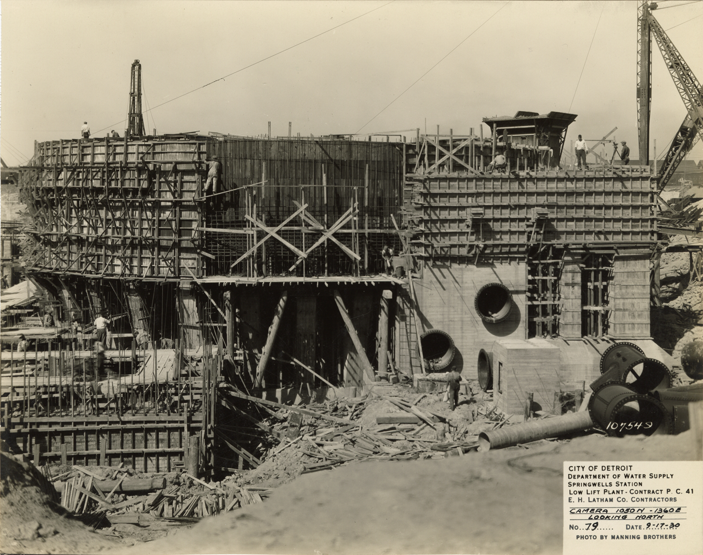 View of low lift plant in the Springwells Station treatment plant during construction, Detroit water supply system. Printed on front: "City of Detroit. Department of Water Supply. Springwells Station. Low lift plant. Contract P.C. 41. E.C. Latham Co., contractors. Camera 1050N-1360E looking north. No. 79. Date: 9-17-30. Photo by Manning Brothers."
