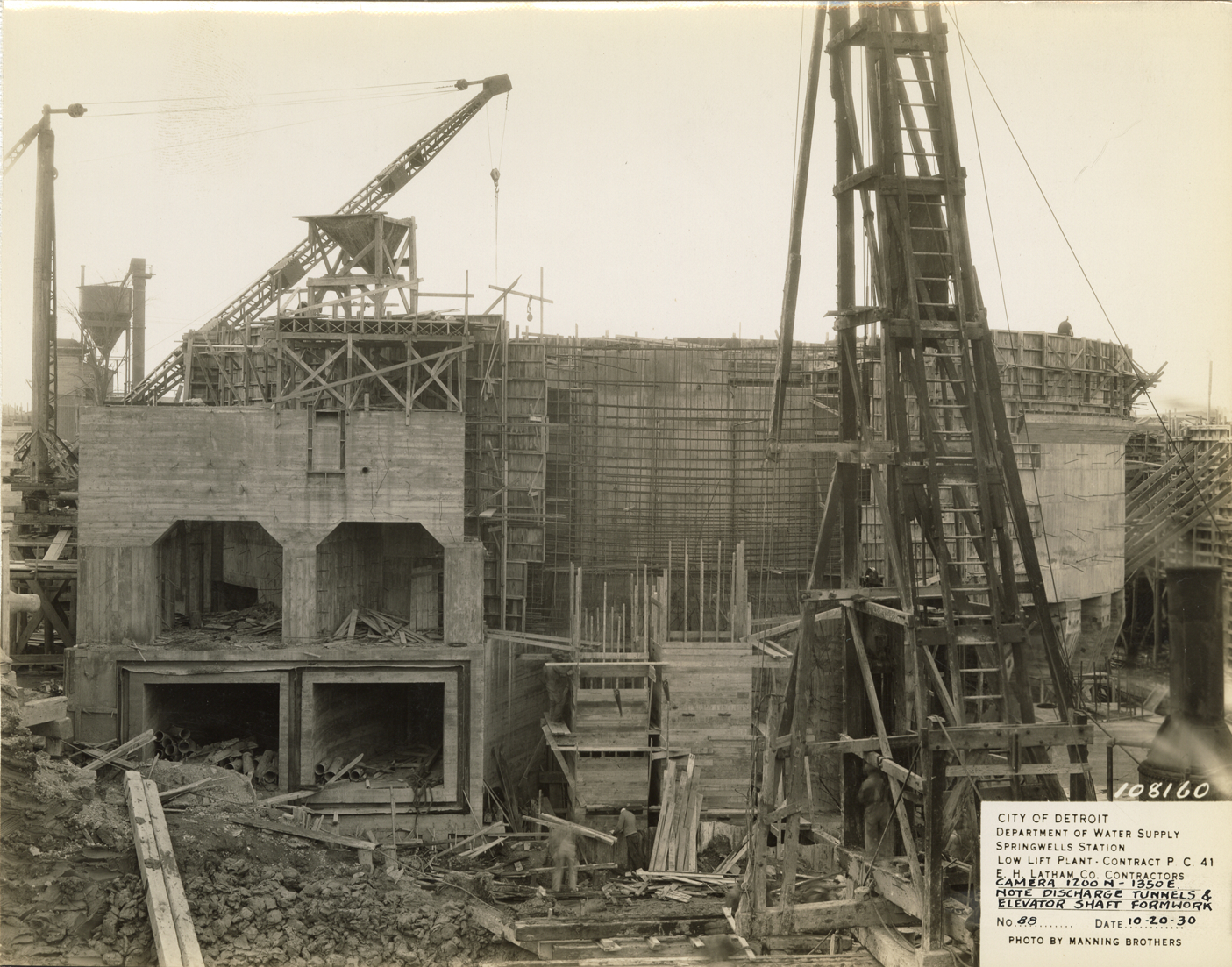 View of low lift plant in the Springwells Station treatment plant during construction, Detroit water supply system. Printed on front: "City of Detroit. Department of Water Supply. Springwells Station. Low lift plant. Contract P.C. 41. E.C. Latham Co., contractors. Camera 1200N-1350E. Note discharge tunnels & elevator shaft formwork. No. 88. Date: 10-20-30. Photo by Manning Brothers."