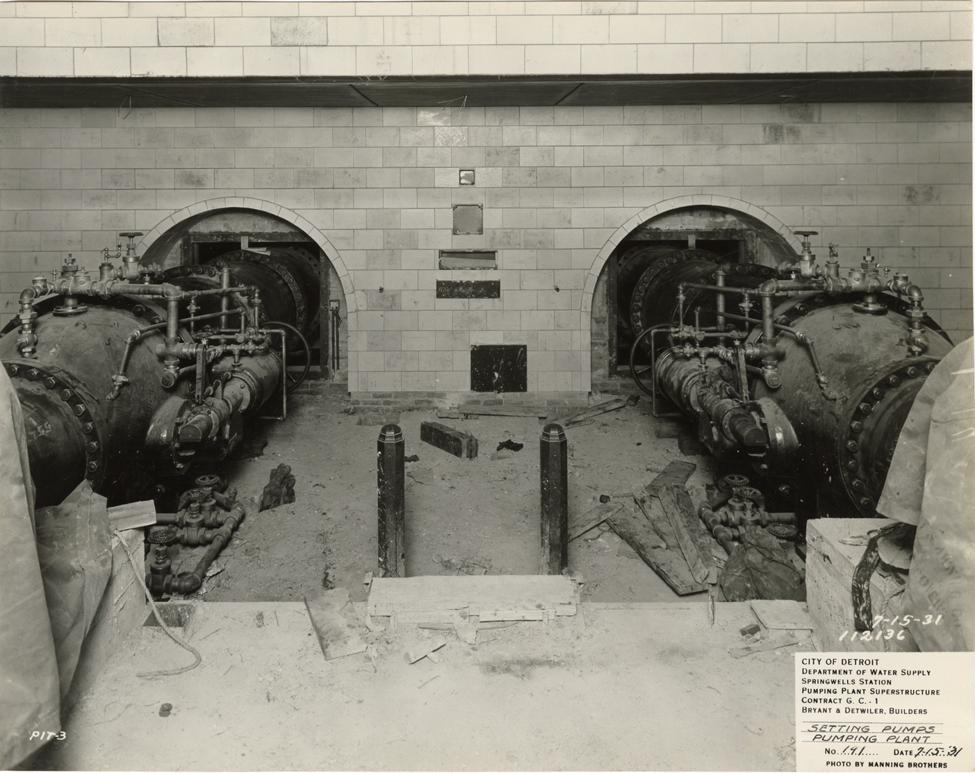 View of setting pumps in the pumping plant superstructure at the Springwells Station treatment plant during construction, Detroit water supply system. Printed on front: "City of Detroit. Department of Water Supply. Springwells Station. Pumping plant superstructure. Contract G.C. 1. Bryant & Detwiler, builders. Setting pumps, pumping plant. No. 191. Date: 7-15-31. Photo by Manning Brothers."