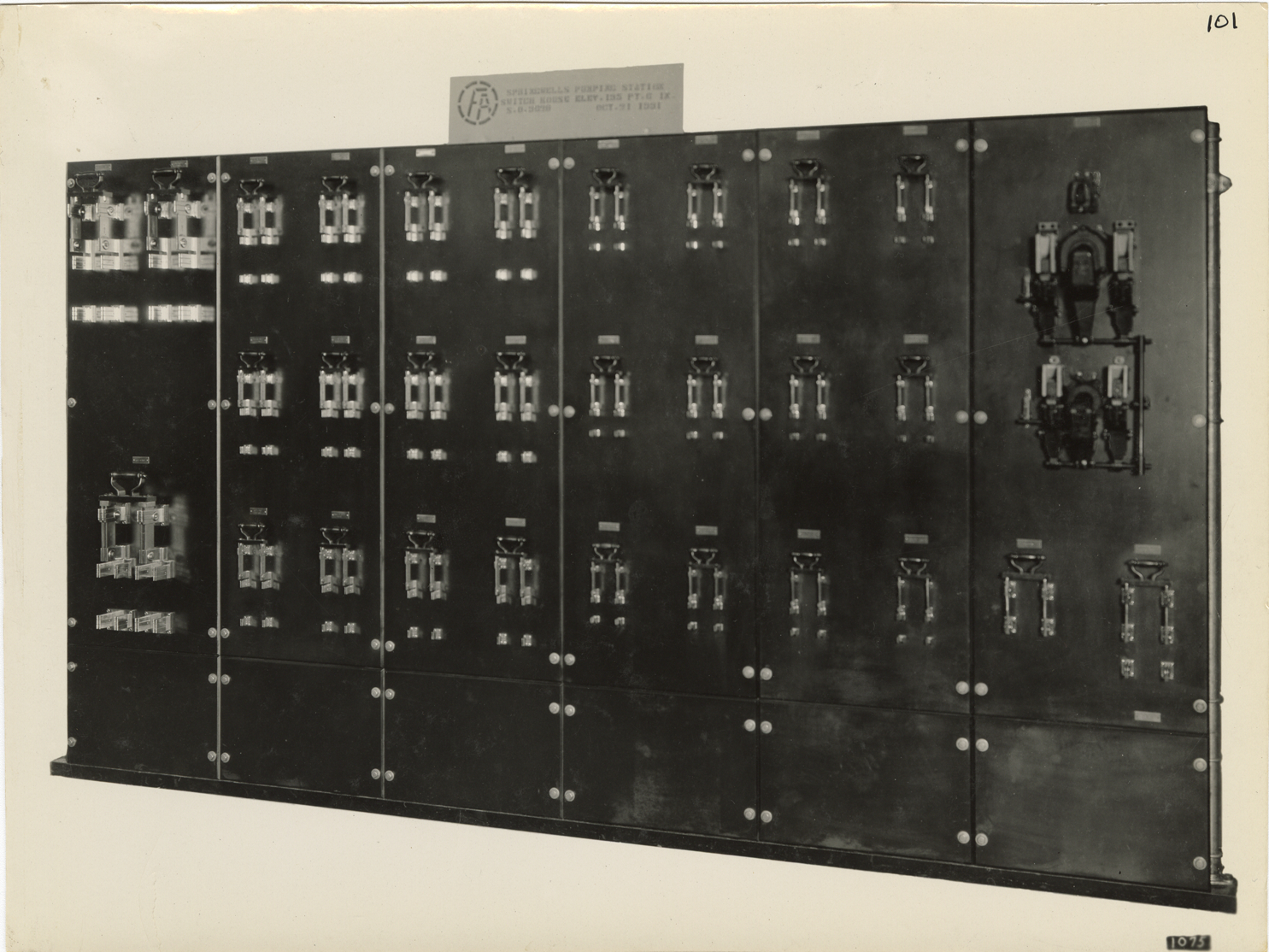 View of control panel for switch house in the Springwells Station treatment plant during construction, Detroit water supply system. Sign over panel reads: "Springwells Pumping Station, Detroit, Mich. Switch house. Elev. 135 ft. 6 in. October 21, 1931. S.O. [undecipherable]."
