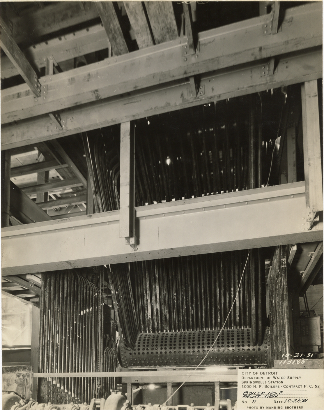 View of boiler tubes in the Springwells Station treatment plant during construction, Detroit water supply system. Printed on front: "City of Detroit. Department of Water Supply. Springwells Station. 1000 h.p. boilers. Contract P.C. 52. Boiler no. 2. Front view. No. 11. Date: 10-21-31. Photo by Manning Brothers."
