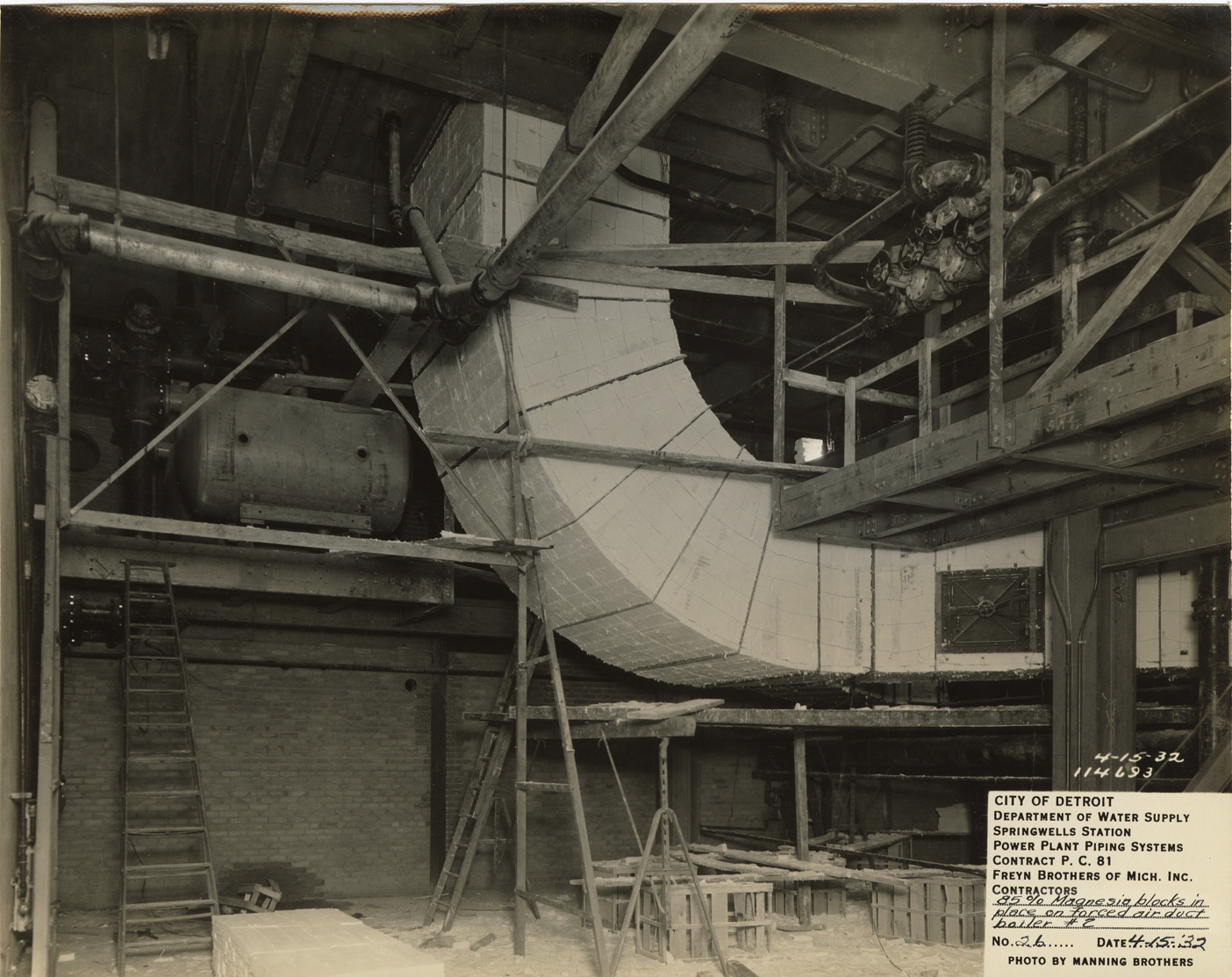 View of forced air duct for boiler, Springwells Station treatment plant during construction, Detroit water supply system. Printed on front: "City of Detroit. Department of Water Supply. Springwells Station. Power plant piping systems. Contract P.C. 81. Freyn Brothers of Mich. Inc., contractors. 85% magnesia blocks in place on forced air duct, boiler #2. No. 26. Date: 4-15-32. Photo by Manning Brothers."