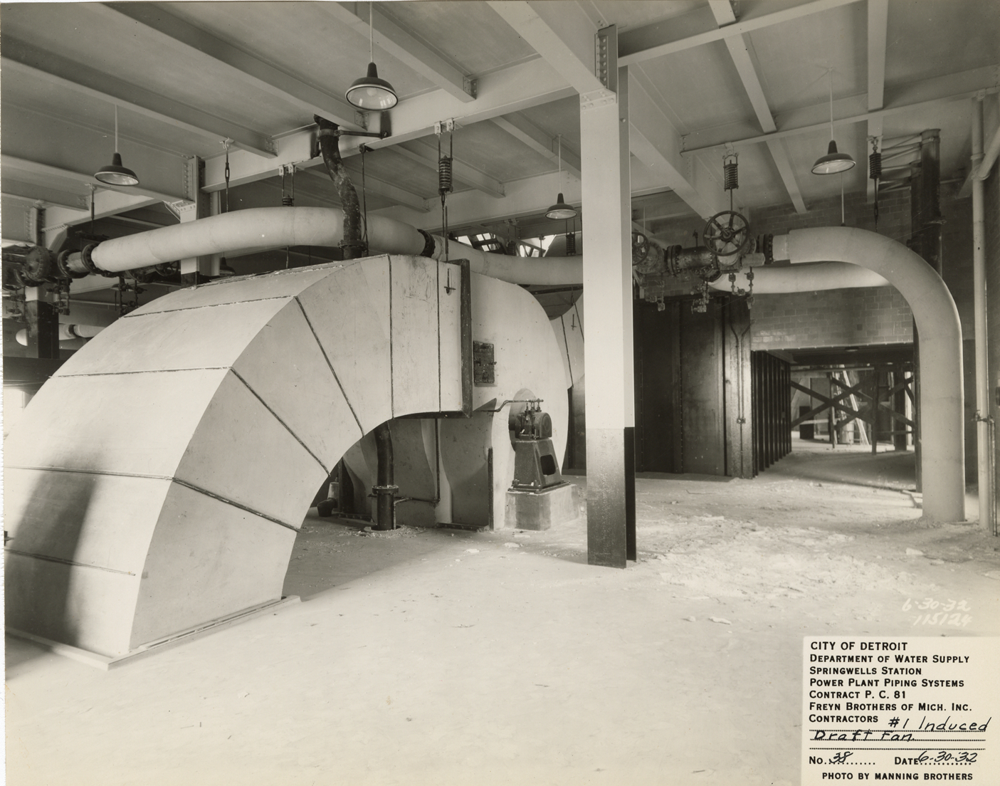 View of induced draft fan, Springwells Station treatment plant during construction, Detroit water supply system. Printed on front: "City of Detroit. Department of Water Supply. Springwells Station. Power plant piping systems. Contract P.C. 81. Freyn Brothers of Mich. Inc., contractors. #1 induced draft fan. No. 38. Date: 6-30-32. Photo by Manning Brothers."