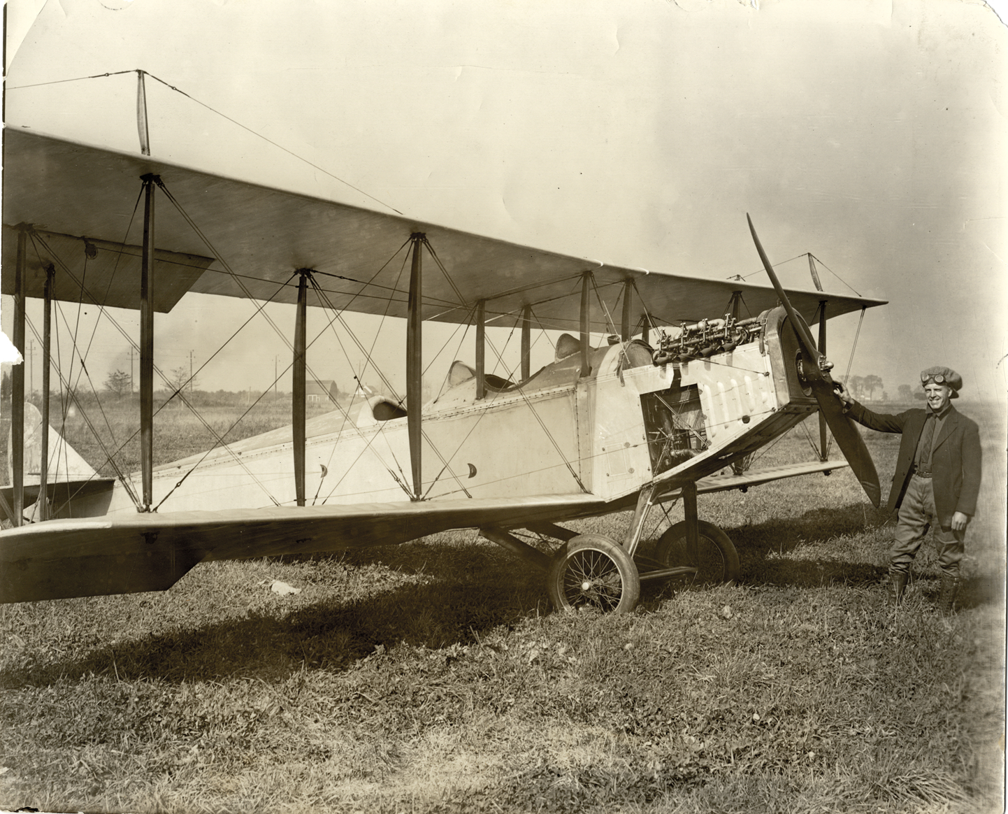 View of John T. Patterson, aviator and manager of the Solar Aerial Company, posing with a biplane at Morrow Field. Stamped on back: "Miller-Rose & Co., commercial photographers. Main 7272. 320-4 Bagley Ave., Detroit, Michigan." Handwritten on back: "J.T. Patterson. Solar Aerial Co. plane, Morrow Field."