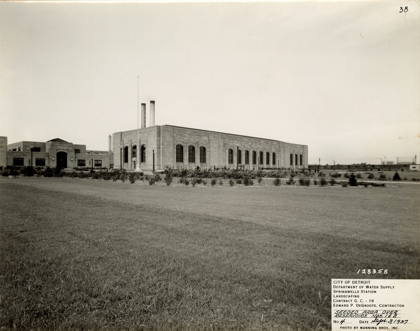 View of seeded area over reservoirs, Springwells Station, Detroit water supply system. Printed on front: "City of Detroit. Department of Water Supply. Springwells Station. Landscaping. Contract G.C.-19. Edward P. DeGroote, contractor. Seeded area over reservoirs nos. 1 & 2. No. 4. Date: Sept. 3, 1937. Photo by Manning Bros., Inc."