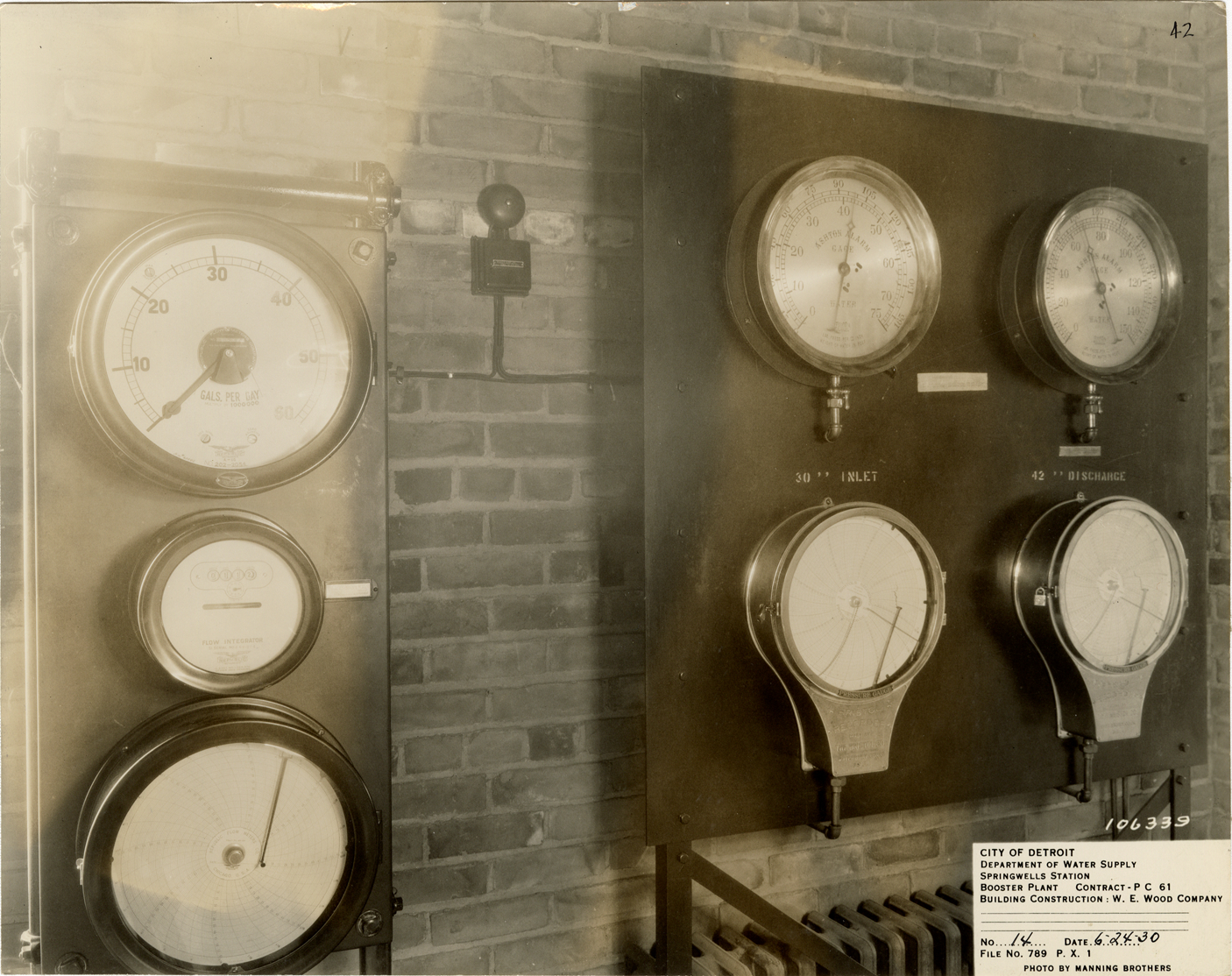 View of two panels with gauges in booster plant during construction, Springwells Station, Detroit water supply system. Printed on front: "City of Detroit. Department of Water Supply. Springwells Station. Booster plant. Contract PC-61. Building construction: W.E. Wood Company. No. 14. Date: 6-24-30. File no. 789 P.X. 1. Photo by Manning Bros., Inc."