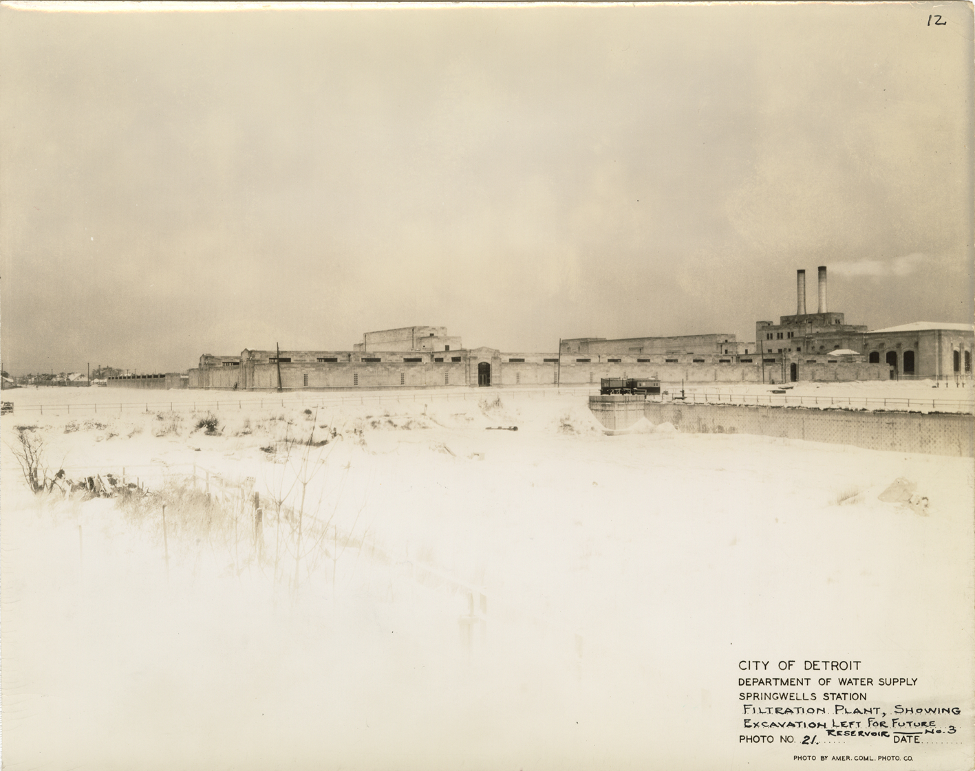 View of Filtration Building and excavation for reservoir no. 3, Springwells Station, Detroit water supply system. Printed on front: "City of Detroit. Dept. of Water Supply. Springwells Station. Filtration plant, showing excavation left for future reservoir no. 3. Photo no. 21. Date: [blank]. Photo by Amer. Coml. Photo Co."