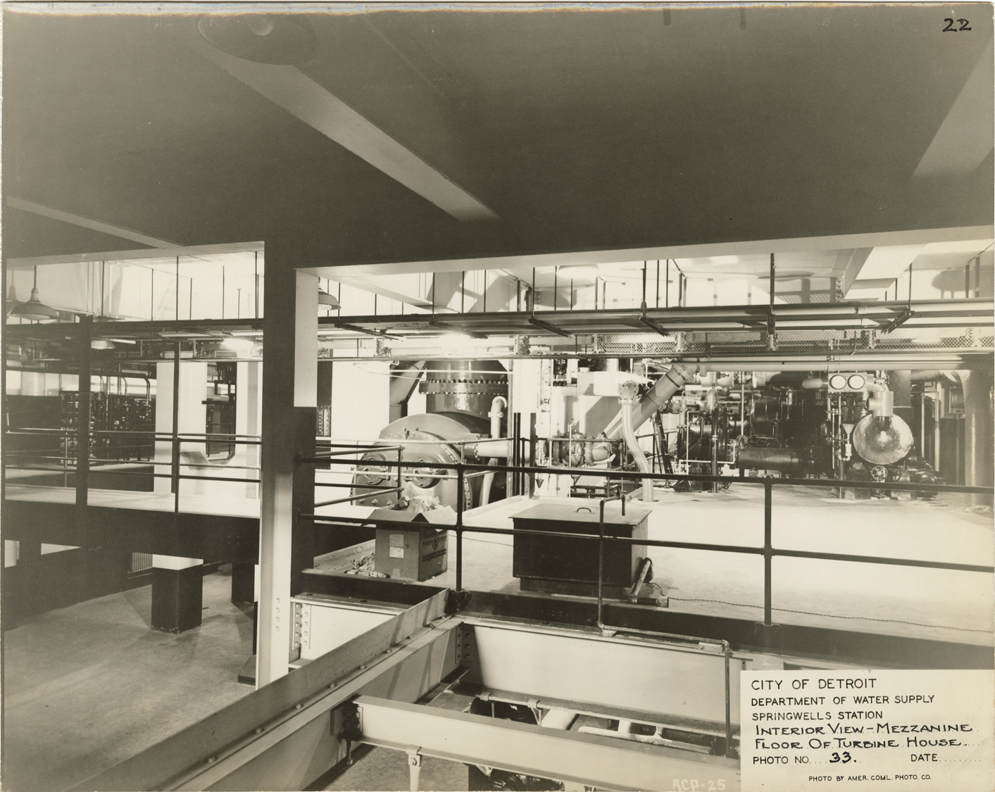 View of the interior of the turbine house, Springwells Station, Detroit water supply system. Printed on front: "City of Detroit. Dept. of Water Supply. Springwells Station. Interior view, mezzanine floor of turbine house. Photo no. 33. Date: [blank]. Photo by Amer. Coml. Photo Co."
