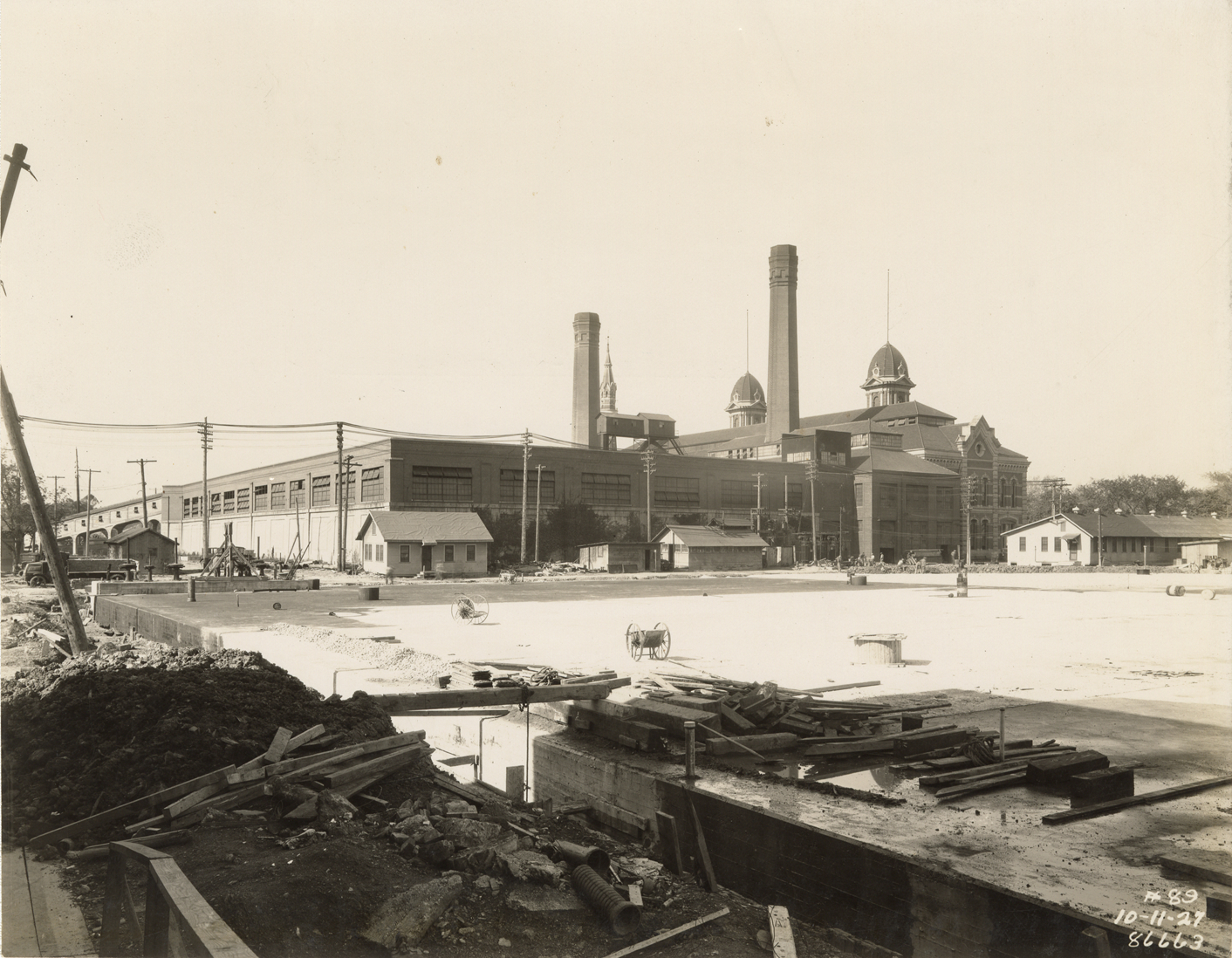 View of roof slab for reservoir no. 2 being coated with asphalt, Waterworks Park, Detroit water supply system. Printed on front: "10-11-27." Stamped on back: "Manning Bros., commercial photographers. 504-505 Lincoln Building. Corner State and Park Sts., Detroit, Mich." Typed on back: "Miscellaneous. Water Works Park. Roof slab being asphalt coated, looking northwest from filtrration [sic] plant window."
