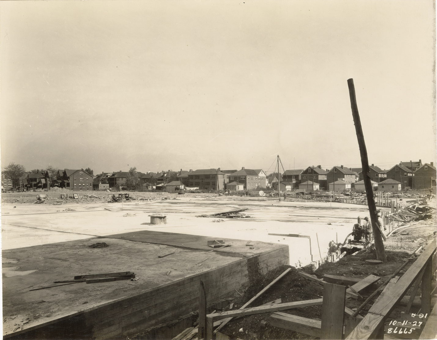 View of roof slab for reservoir no. 2 during construction, Waterworks Park, Detroit water supply system. Houses in background. Printed on front: "10-11-27." Stamped on back: "Manning Bros., commercial photographers. 504-505 Lincoln Building. Corner State and Park Sts., Detroit, Mich." Typed on back: "Miscellaneous. Water Works Park. Roof slab taken from filter plant window looking northeast."