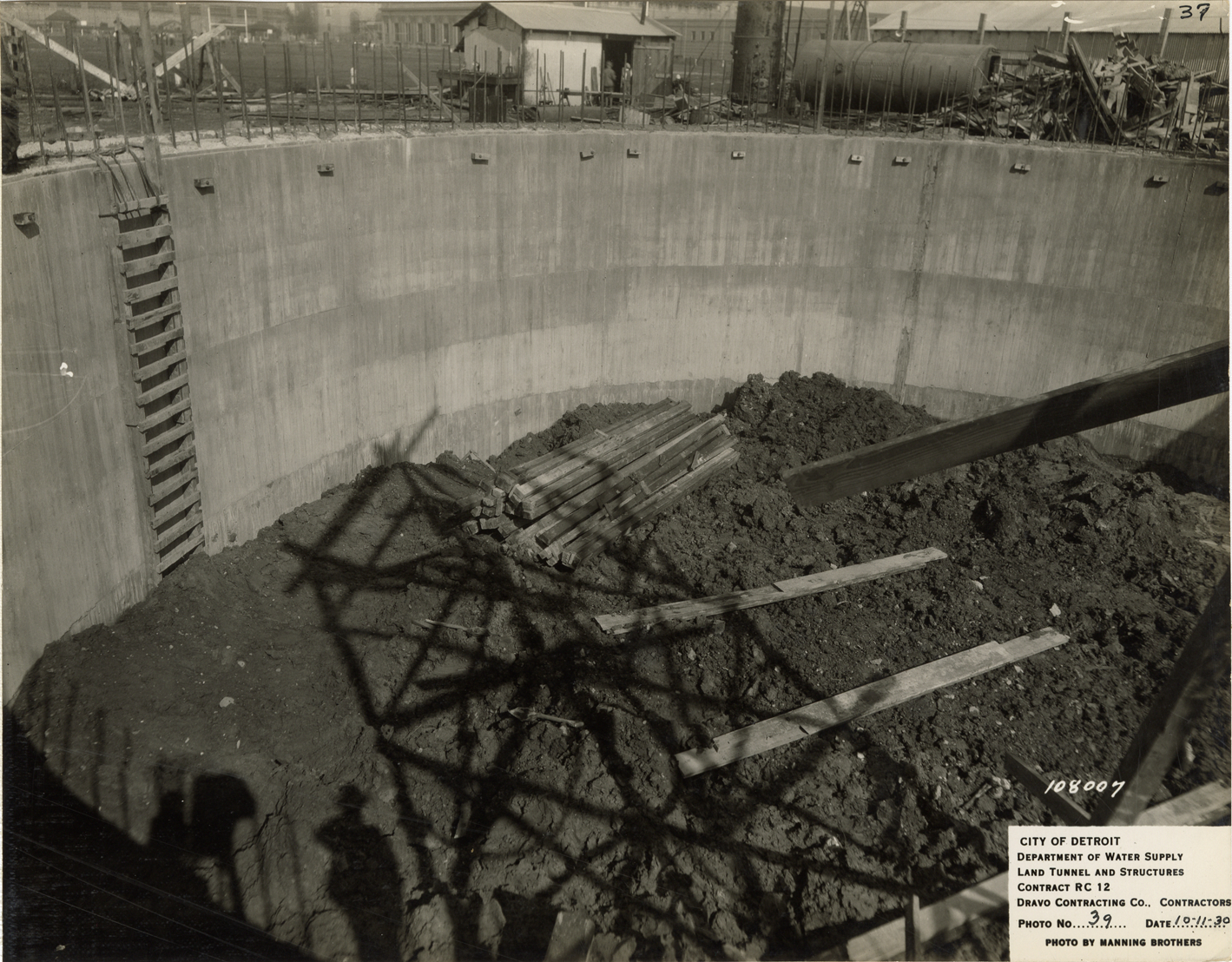 Overhead view of sinking screen chamber caisson, Waterworks Park, Detroit water supply system. Printed on front: "City of Detroit. Department of Water Supply. Land tunnel and structures. Contract RC 12. Dravo Contracting Co., contractors. Photo no. 39. Date: 10-11-30. Photo by Manning Brothers." Typed on back: "Sinking screen chamber caisson."