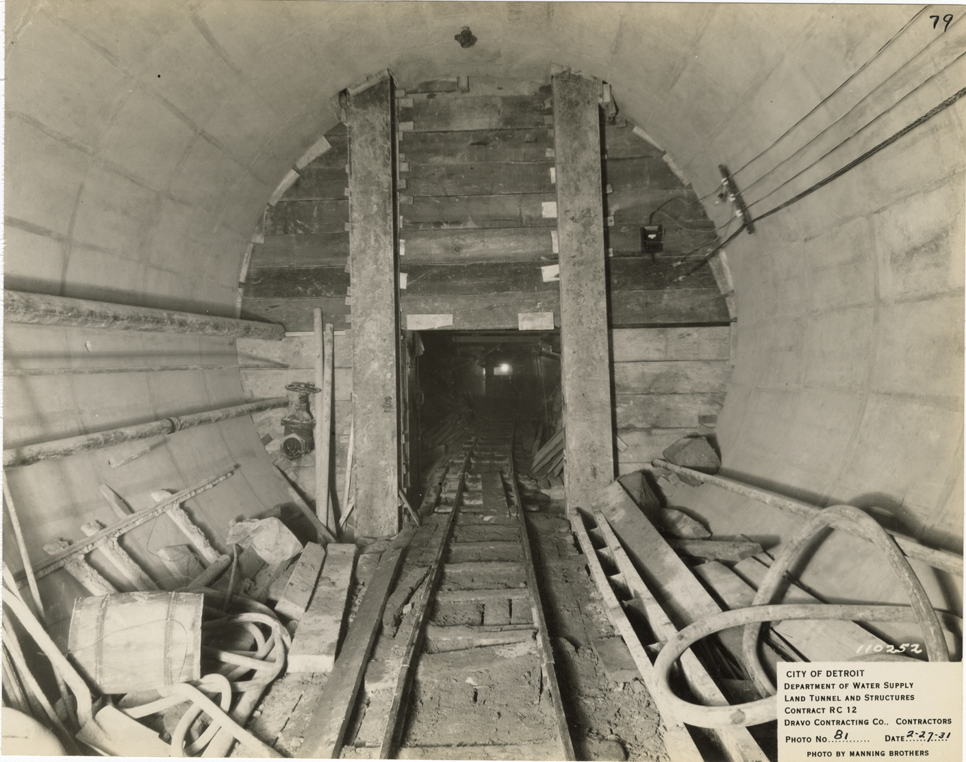 View of south heading of tunnel during construction, Waterworks Park, Detroit water supply system. Printed on front: "City of Detroit. Department of Water Supply. Land tunnel and structures. Contract RC 12. Dravo Contracting Co., contractors. Photo no. 81. Date: 2-27-31. Photo by Manning Brothers." Typed on back: "South heading of 15-ft. 6-in. tunnel; looking southward at safety bulkhead at Sta. 37+55, behind which men may retreat in case trouble develops in going under the 6-ft intake pipe."