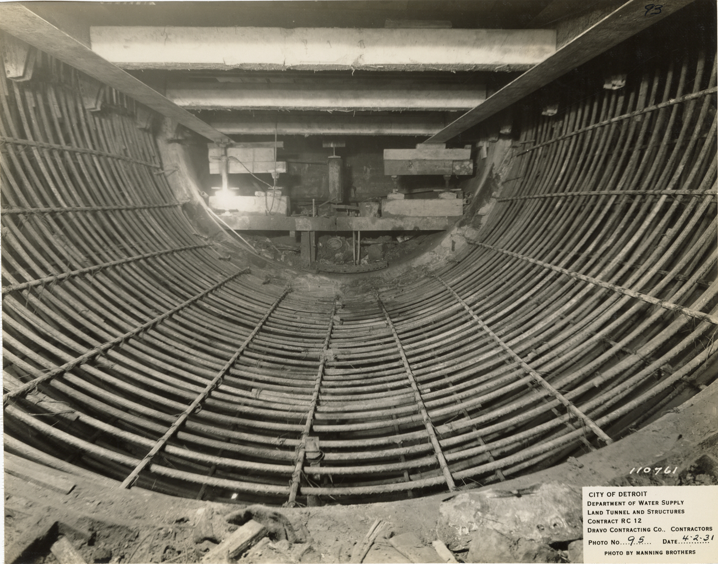 View of south heading of tunnel during construction, Waterworks Park, Detroit water supply system. Printed on front: "City of Detroit. Department of Water Supply. Land tunnel and structures. Contract RC 12. Dravo Contracting Co., contractors. Photo no. 95. Date: 4-2-31. Photo by Manning Brothers." Typed on back: "14 ft. tunnel south heading view of reinforcing steel above springing line in the last 18 ft. of tunnel at screen chamber."