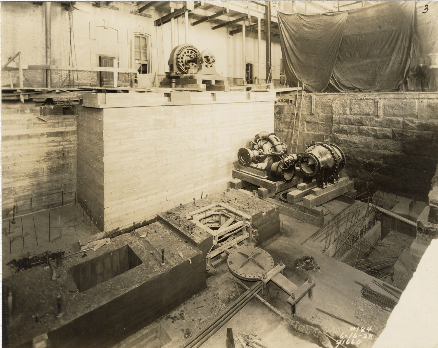 View of interior of pumping station no. 1, showing suction chamber, Waterworks Park, Detroit water supply system. Printed on front: "#184, 6-16-28." Stamped on back: "Manning Bros., commercial photographers. 504-505 Lincoln Building. Corner State and Park Sts., Detroit, Mich." Handwritten on back: "Looking south showing suction chamber, Sta. #1, W.W.P. Sta. Work by Water Board labor."