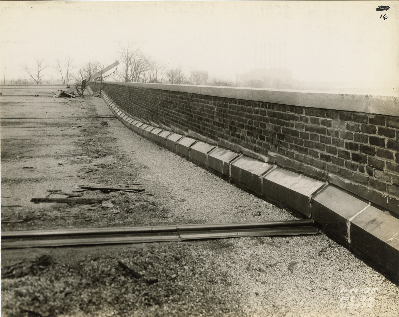 View of roof flashing at south wall of coagulation basin, Waterworks Park, Detroit water supply system. Printed on front: "1-11-35." Stamped on back: "Manning Bros. Inc., commercial photographers. 333 State St., Room 505. Detroit, Michigan." Typed on back: "Contract FC-32. View roof flashing at south wall of coagulation basin, Water Works Park."