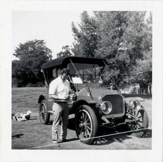 View of a man standing next to a 1910 Buick Model 10 car. Handwritten on back: "1910 Buick, Model 10."