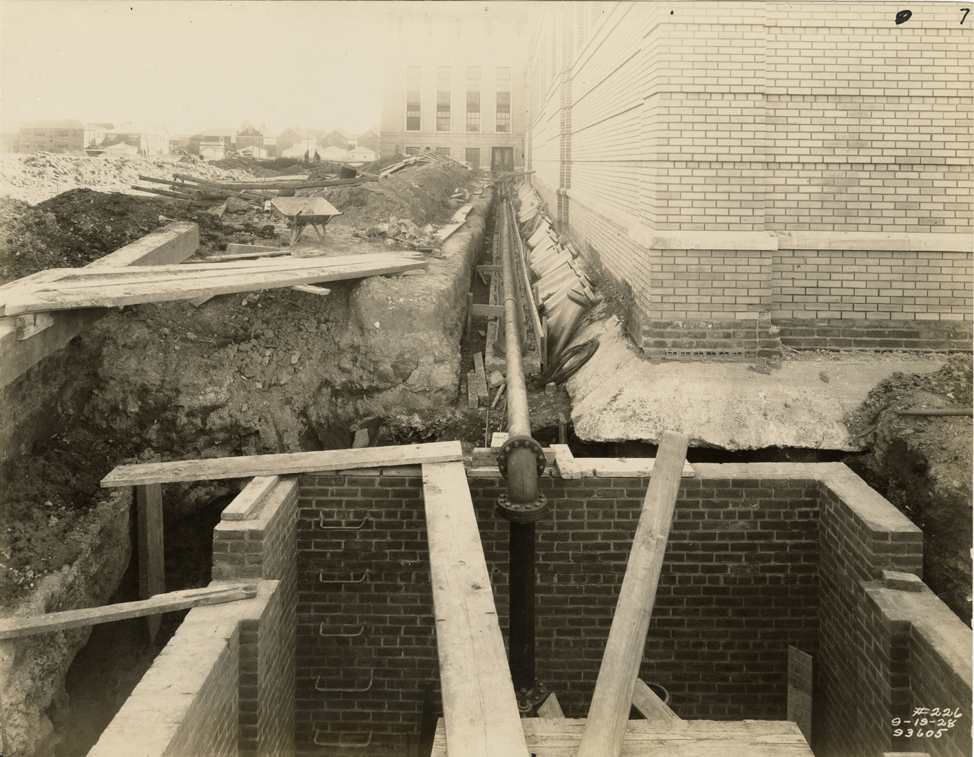 View of steam heating line during construction, Waterworks Park, Detroit water supply system. Printed on front: "9-19-28." Stamped on back: "Manning Bros., commercial photographers. 504-505 Lincoln Building. Corner State and Park Sts., Detroit, Mich." Typed on back: "Water Works Park Station. Steam heating line construction in front of filtration plant."