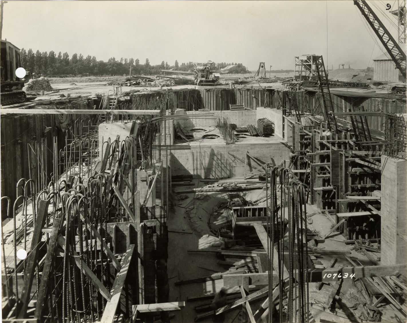 View of intake structure, Detroit water supply system. Stamped on back: "Manning Bros., commercial photographers. 504-505 Lincoln Building. Corner State and Park Sts., Detroit, Mich." Typed on back: "Intake structure, view looking westward."