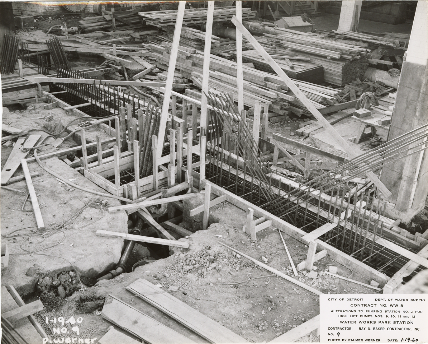 View of forms and reinforcing steel for flood wall footing, pumping station no. 2, Waterworks Park, Detroit water supply system. Printed on front: "City of Detroit. Dept. of Water Supply. Contract no. WW-8. Alterations to pumping station no. 2 for high lift pumps nos. 9, 10, 11 and 12. Water Works Park Station. Contractor: Ray D. Baker contractor, Inc. No. 9. Date: 1-19-60. Photo by Palmer Werner." Typed on back: "Forms and reinforcing steel in place for flood wall footing."