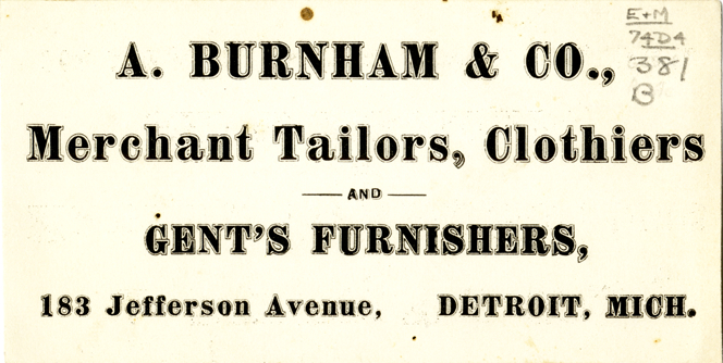 View of a business card for A. Burnham & Co., merchant tailors, clothiers and gent's furnishers, 183 Jefferson Avenue, Detroit, Mich."
