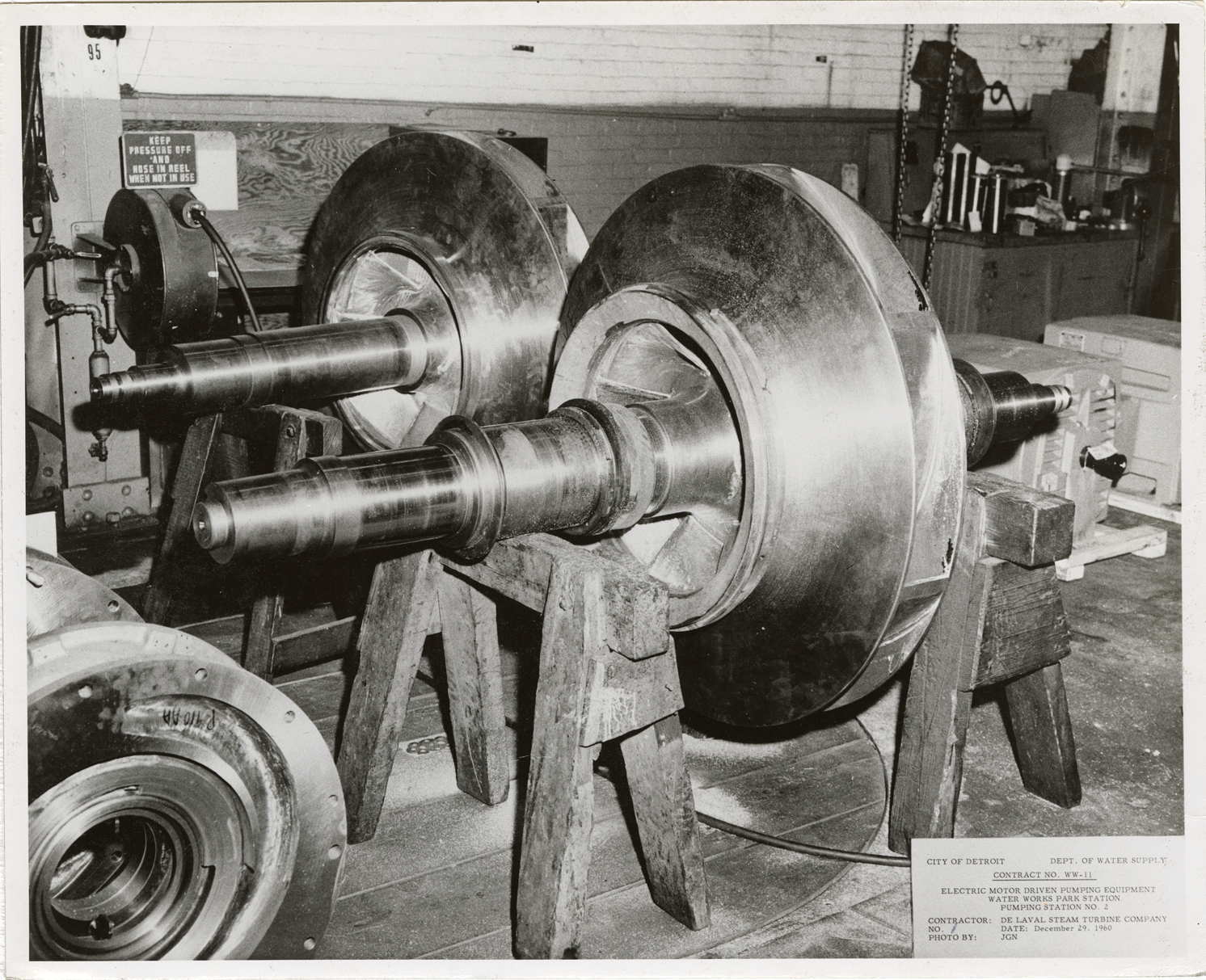 View of impellers assembled to shafts, pumping station no. 2, Waterworks Park, Detroit water supply system. Printed on front: "City of Detroit. Dept. of Water Supply. Contract no. WW-11. Electric motor driven pumping equipment. Water Works Park Station. Pumping station no. 2. Contractor: De Laval Steam Turbine Company. No. 1. Date: December 29, 1960. Photo by: JGN." Typed on back: "Contract no. WW-11. Photo #1. Impellers assembled to shafts."