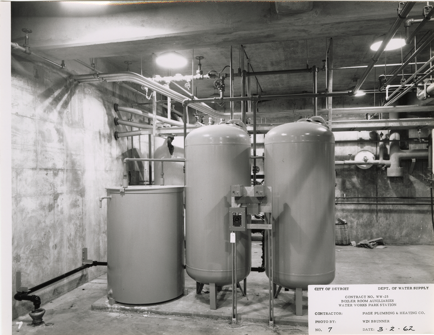 View of water softening unit, Waterworks Park, Detroit water supply system. Printed on front: "City of Detroit. Dept. of Water Supply. Contract no. WW-25. Boiler room auxiliaries. Water Works Park Station. Contractor: Page Plumbing & Heating Co. Photo by: Win Brunner. No. 7. Date: 3-2-62." Typed on back: "Contract no. WW-25. Photo #7. Water softening unit & electrical control."