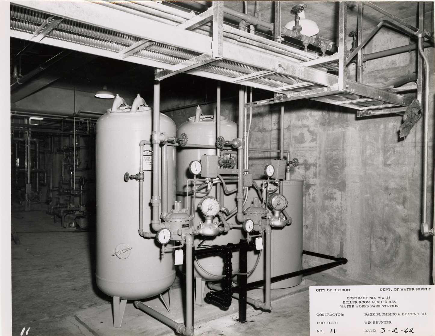 View of water softening unit, Waterworks Park, Detroit water supply system. Printed on front: "City of Detroit. Dept. of Water Supply. Contract no. WW-25. Boiler room auxiliaries. Water Works Park Station. Contractor: Page Plumbing & Heating Co. Photo by: Win Brunner. No. 11. Date: 3-2-62." Typed on back: "Contract no. WW-25. Photo #11. Water softening unit, controls and piping."
