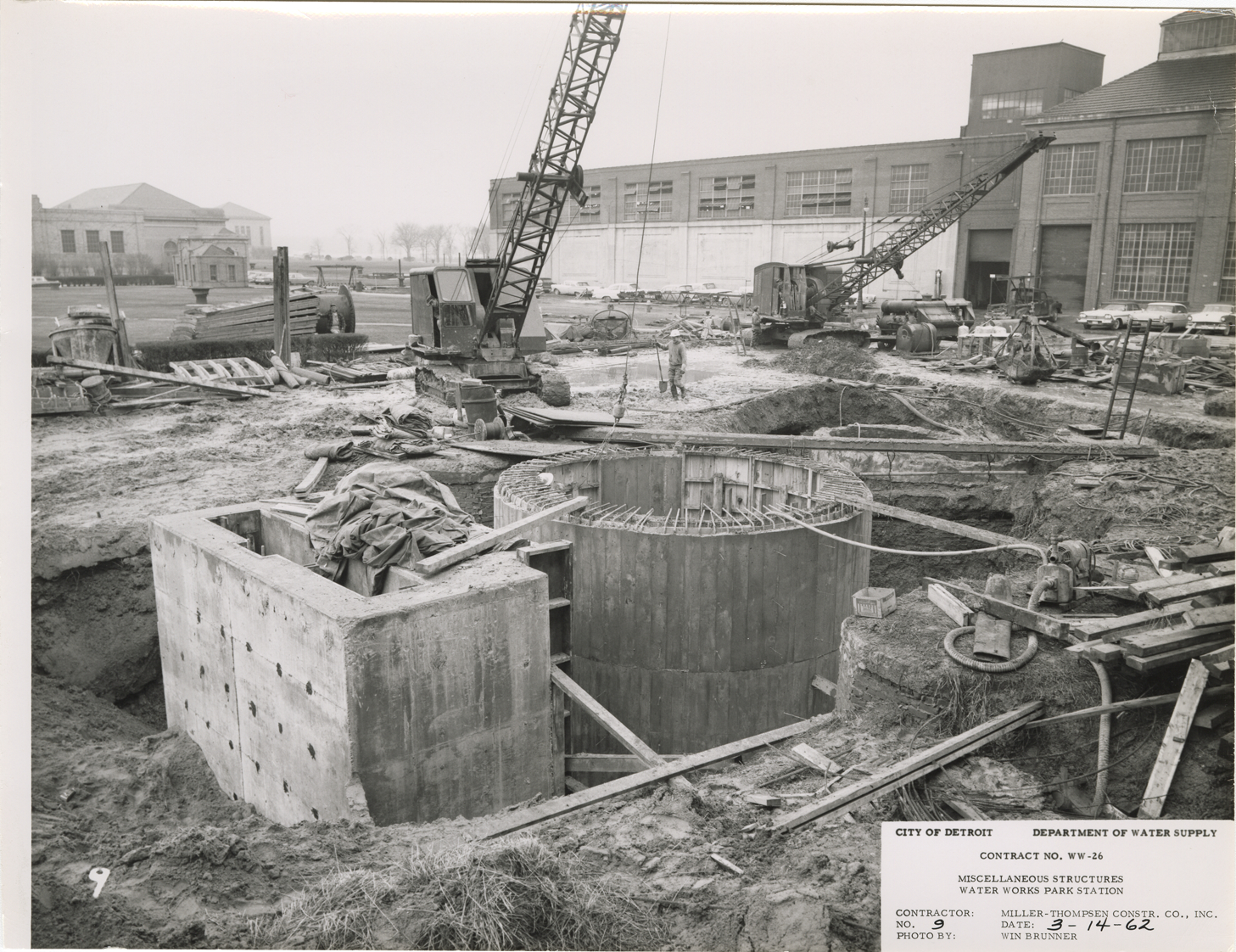 View of partially completed junction well and gate well no. 4, Waterworks Park, Detroit water supply system. Worker and cranes in background. Printed on front: "City of Detroit. Dept. of Water Supply. Contract no. WW-26. Miscellaneous structures. Water Works Park Station. Contractor: Miller-Thompsen Constr. Co., Inc. Photo by: Win Brunner. No. 9. Date: 3-14-62." Typed on back: "Partially completed junction well and gate well no. 4."