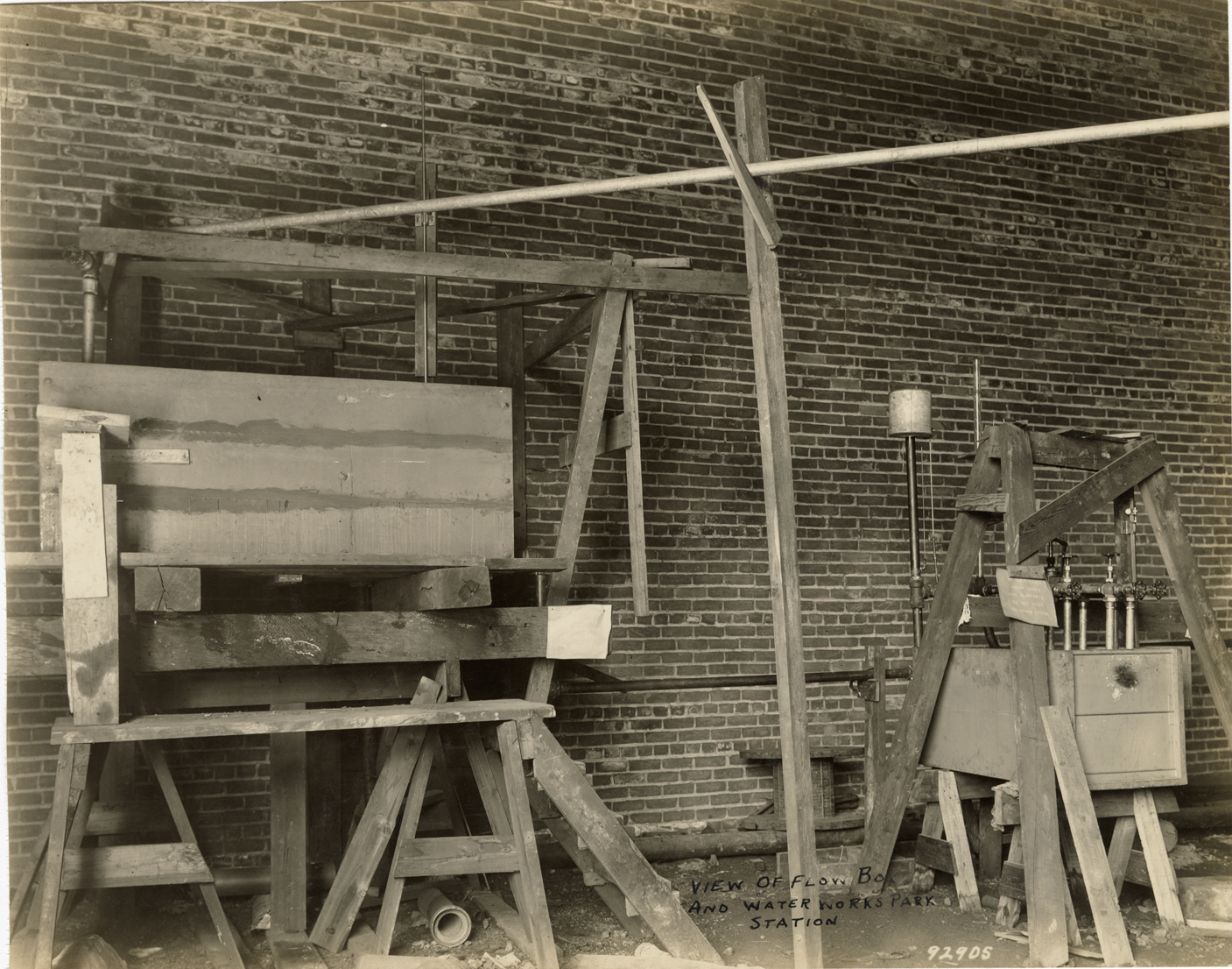 View of flow box, Waterworks Park, Detroit water supply system. Printed on front: "View of flow box and Water Works Park Station." Stamped on back: "Manning Bros., commercial photographers. 504-505 Lincoln Building. Corner State and Park Sts., Detroit, Mich." Handwritten on back: "View of flow box and Waterworks Park Station, surge test."