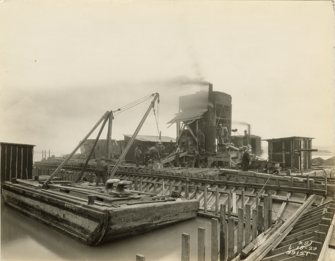 View of form work and concreting plant for dock wall, Waterworks Park, Detroit water supply system. Construction workers on dock. Printed on front: "6-15-29." Stamped on back: "Manning Bros., commercial photographers. 504-505 Lincoln Building. Corner State and Park Sts., Detroit, Mich." Typed on back: "Water Works Park, July 10, 1929. General view of form work and concreting plant, dock wall."