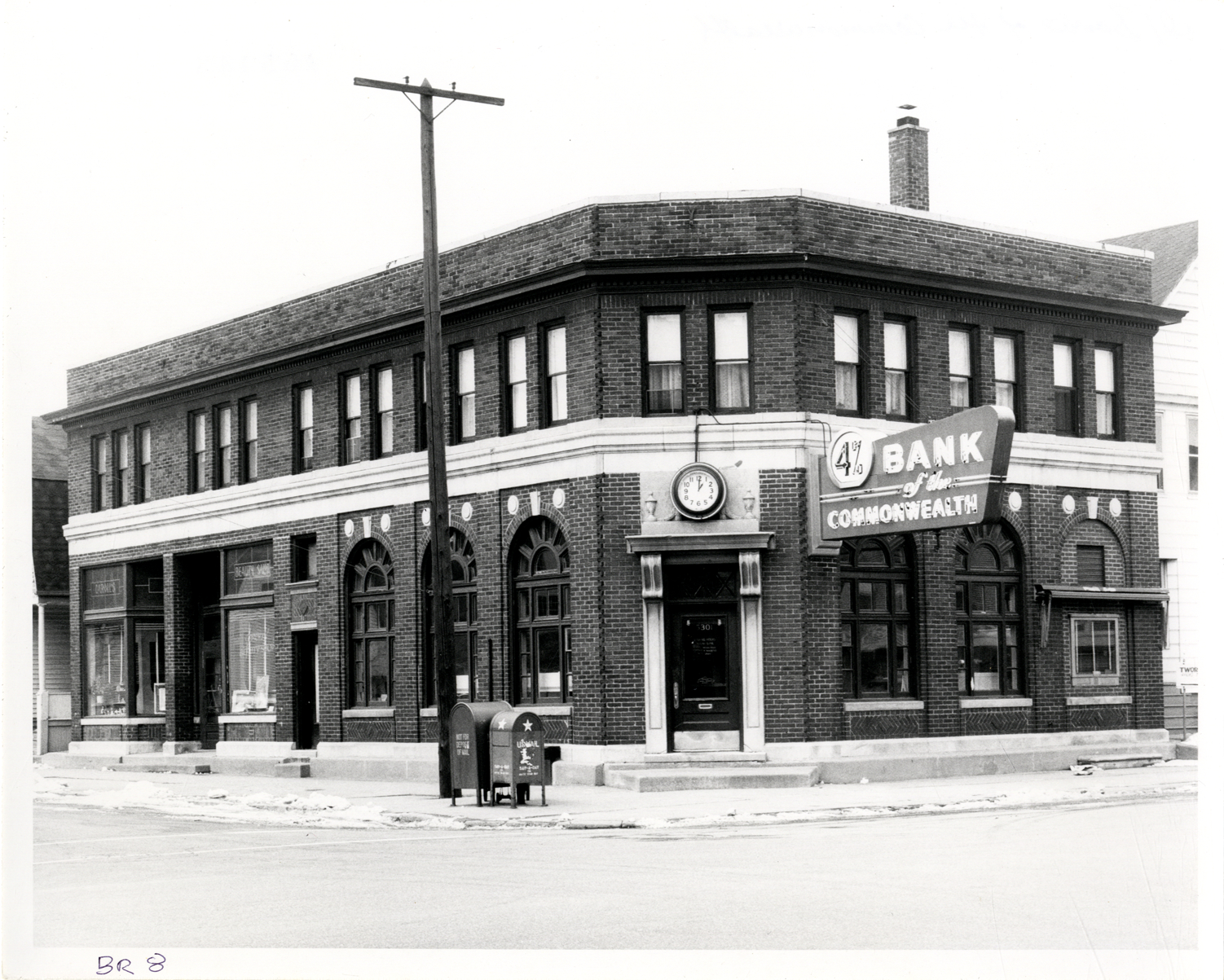 View of the Bank of the Commonwealth, located on the corner of McDougall and Frederick. Mailboxes on corner. Handwritten on front: "BR 8." Handwritten on back: "McDougall-Frederick."