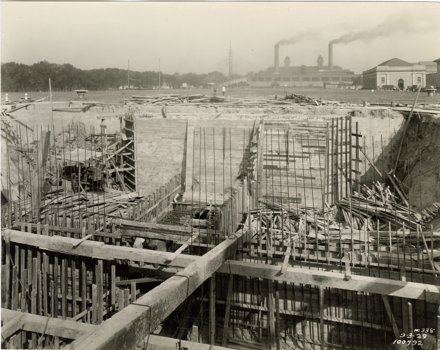 View of forms and reinforcing steel for lower half of screen chamber, auxiliary low lift plant, Waterworks Park,Detroit water supply system. Printed on front: "9-3-29." Stamped on back: "Manning Bros., commercial photographers. 504-505 Lincoln Building. Corner State and Park Sts., Detroit, Mich." Typed on back: "Auxiliary low lift. Contract RC-5. Forms and reinforcing steel. Lower half of screen chamber walls and connecting conduit. Looking northward."